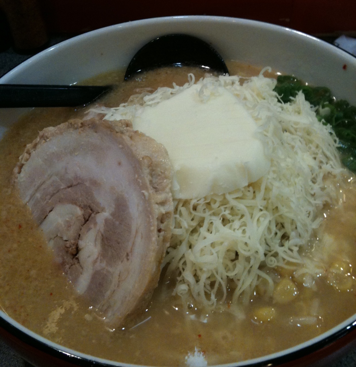 I went to Kintaro Ramen on Denman St. for lunch today. I don’t normally go on a Saturday because it’s so busy on the weekend, but I was craving Kintaro. Best miso ramen broth out there. I’m usually a glutton and get the fatty pork with the rich(fatty) broth. Today I treated myself to the cheese ramen. Cheese ramen is just like their regular miso, but with cheese on top. I can’t figure out if I like it or not, but every once in a while I’m compelled to order it.
