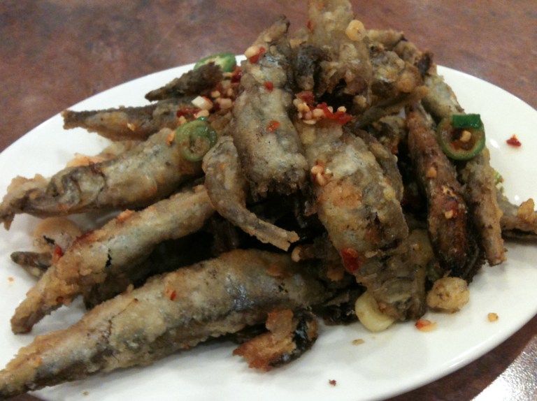 I love these little fried fish. They have a crispy coating on the outside , and a sensational hit of salt, garlic and spiciness from the red chiles and jalapenos. If you’ve never had smelts before, you may be surprised that most of the little fishys have a sack of eggs on the inside, which in my mind is a bonus, although you may not agree. If you haven’t tried these before, they’re worth a try. Let me know if you go, I’m always looking for a partner to eat them with!