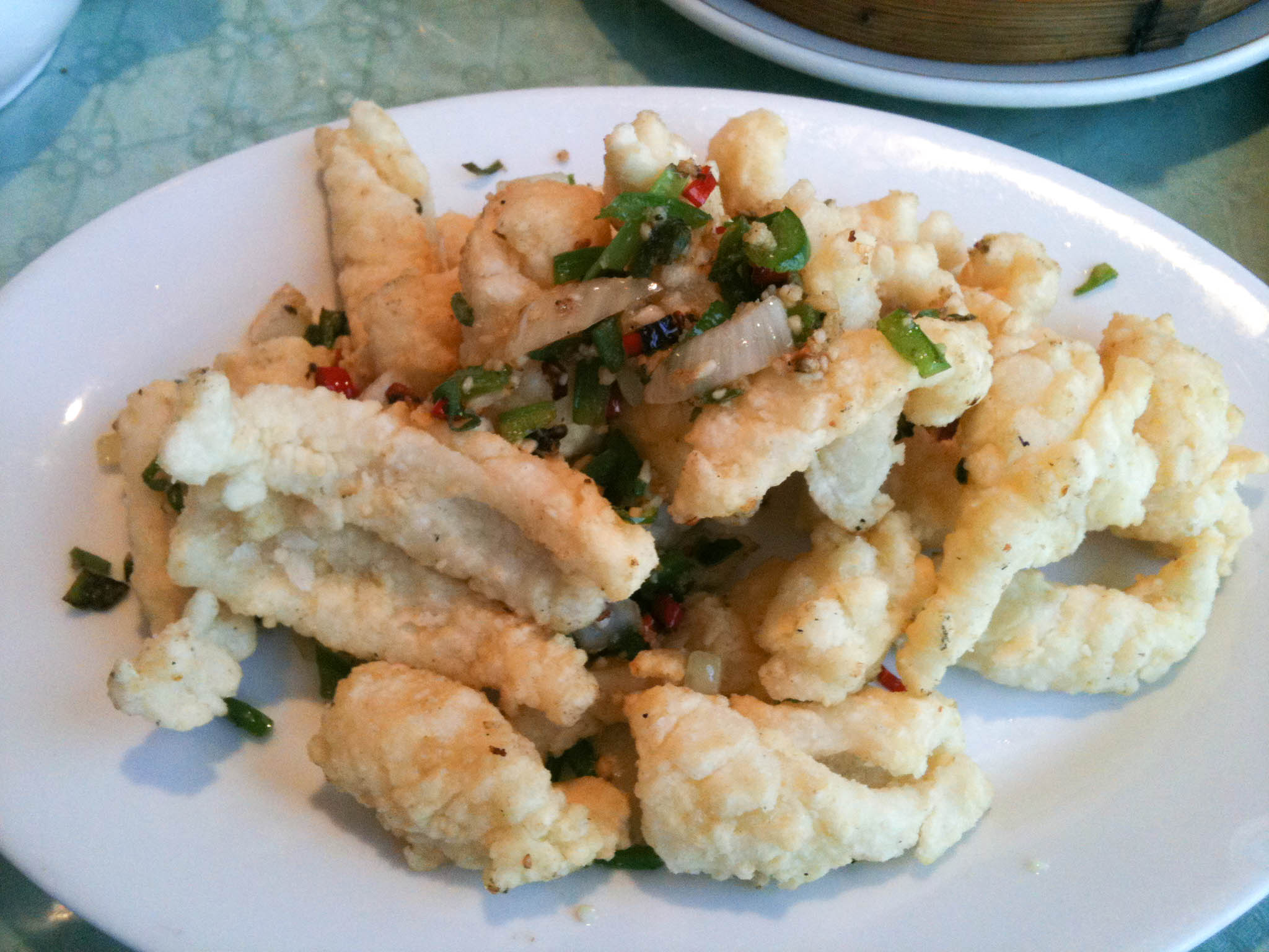 Since there were 5 of us, we decided to get an extra dish. We chose the deep-fried spicy salted squid. This is one of those dishes that gets ordered a lot out at Chinese restaurants in my circles. Who doesn’t like deep-fried squid? I was a bit worried at how light in colour the coating on the squid was because I thought meant they were under fried, but they ended up being so tender, I looked past the colour.