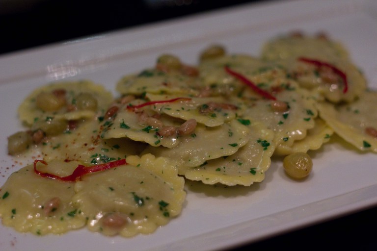 Delightfully light pillows of goat cheese filled ravioli with pine nuts, raisins and chilis in a beautiful butter sauce.