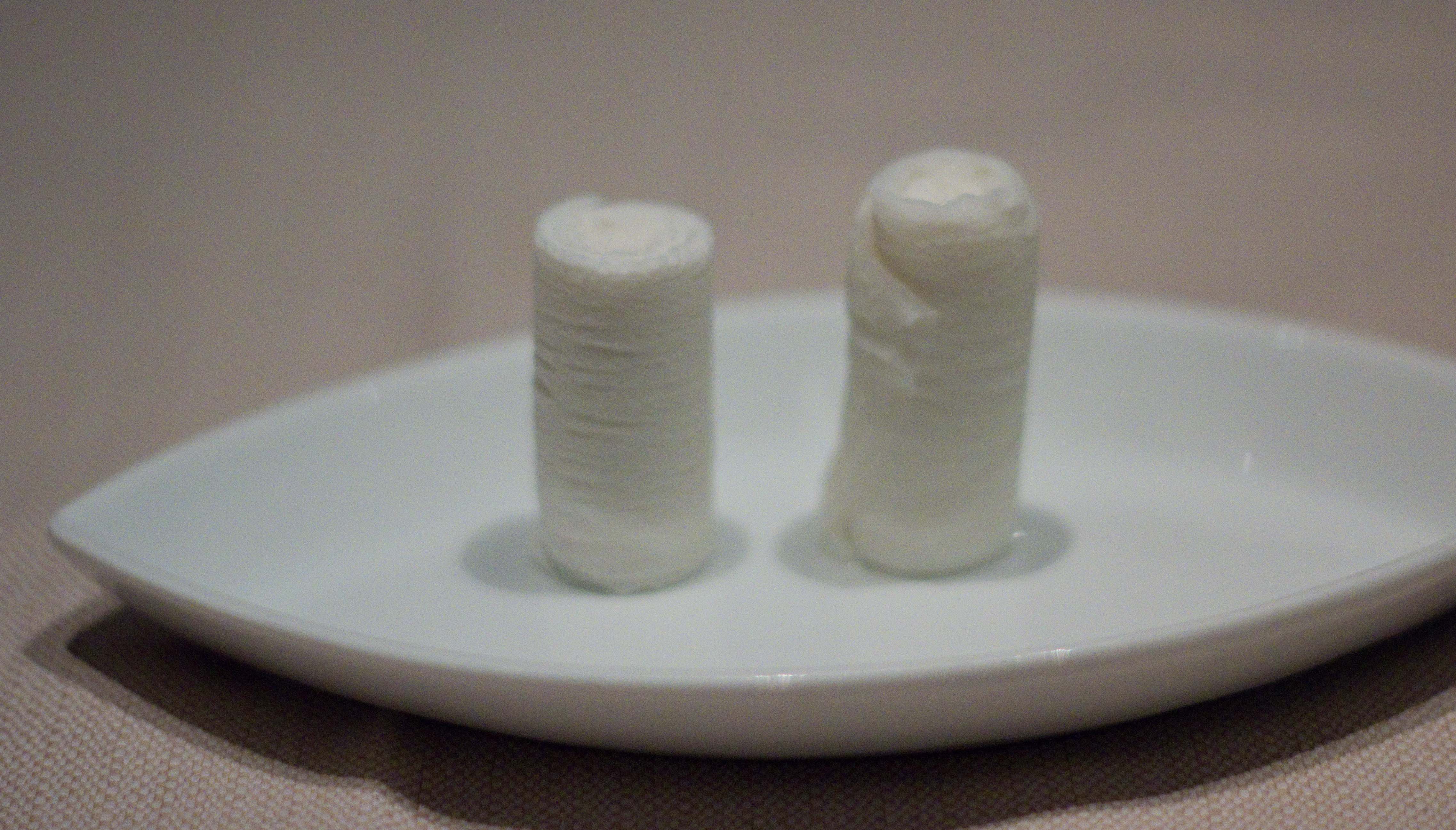 We were then served what looked like 2 Altoids.  I was thinking that it was too early for our after dinner mint, because we had 1 more dish to come.  Then the food runner came and poured some boiling water of the top of them and we watched them expand.