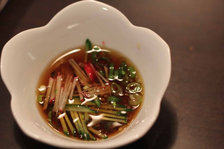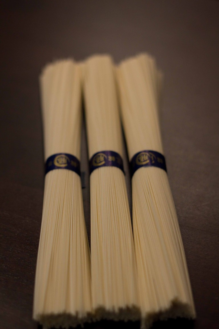 On a hot summer’s evening, nothing’s better to have for dinner than cold somen. Somen is basically a very thin udon noodle, although it can be eaten warm in broth, I only know to eat it served on ice, dipped into a sauce, (mentsuyu or tsuyu for short) garnished with green onions, ginger and my own personal additions.