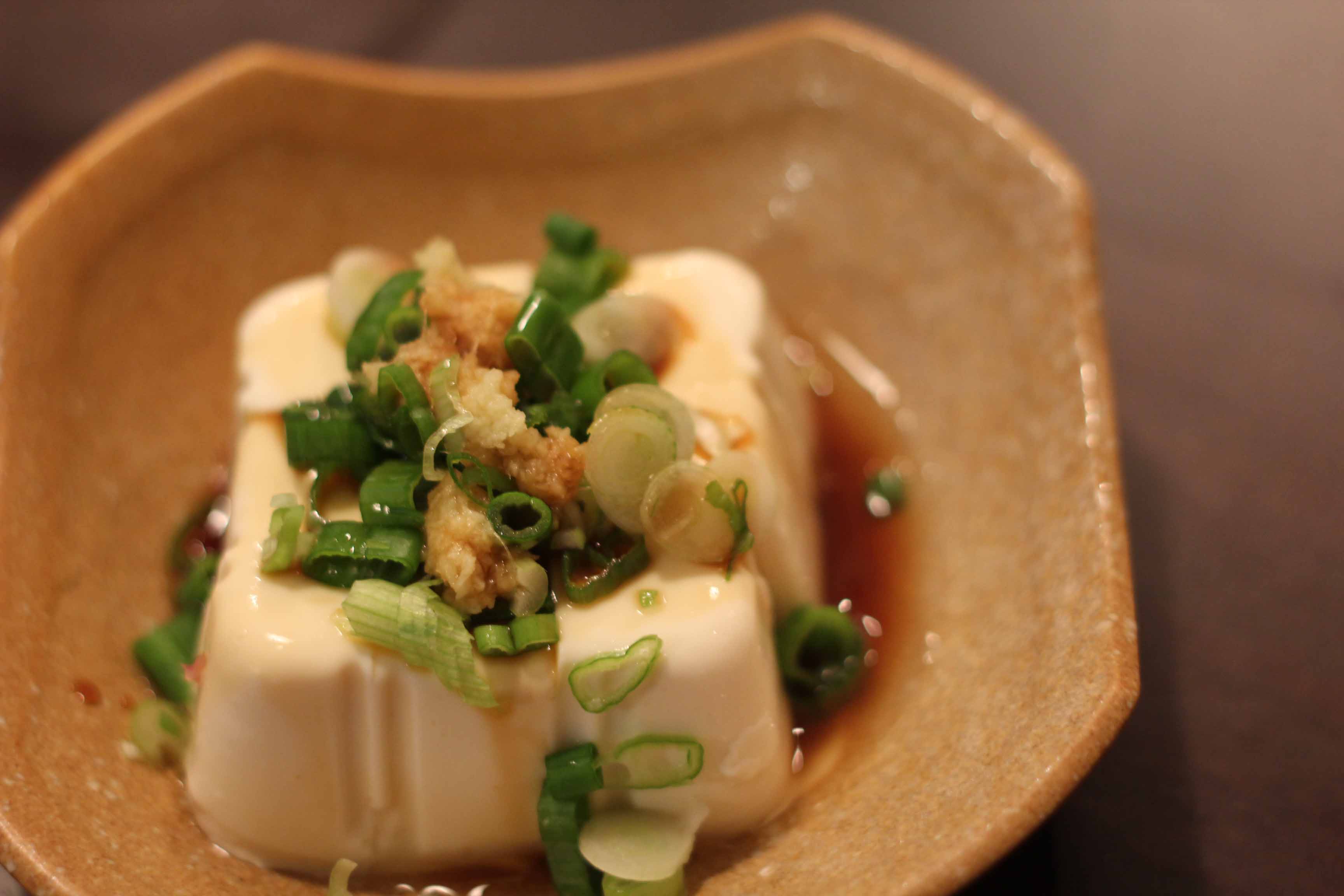 Cut tofu into cubes, top with green onions and ginger, drizzle with soy sauce.