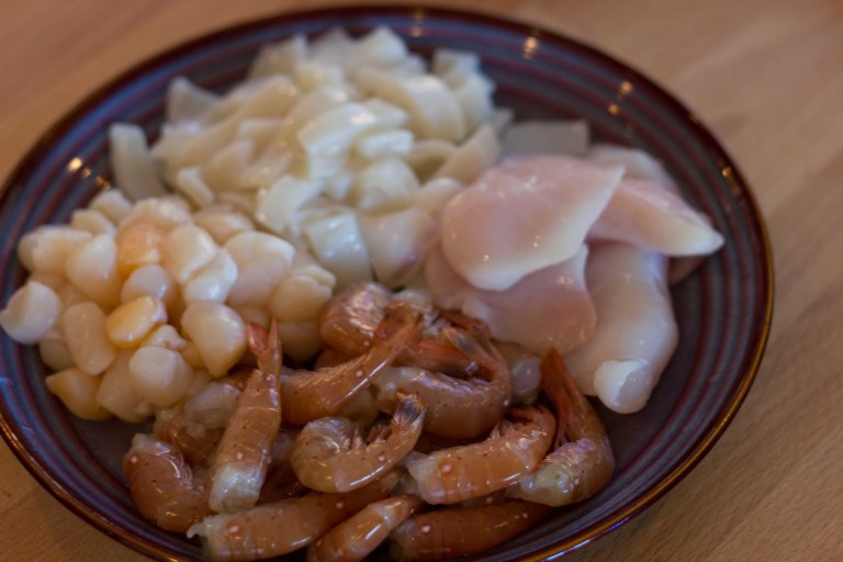 - 1-2 pounds of assorted fish, shellfish, or even chicken thighs if you want.