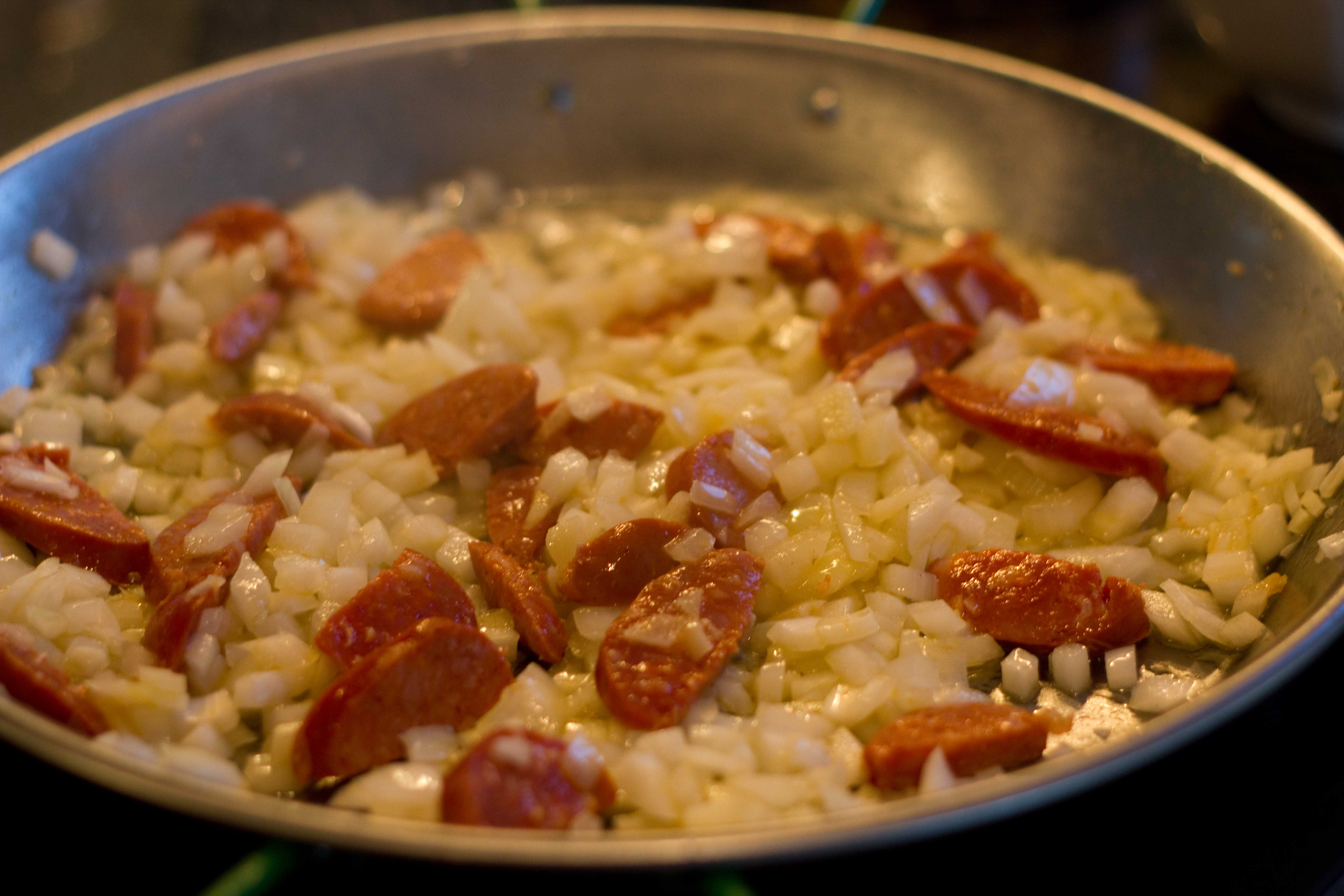 Then it was time to sauté some onion and chorizo. My sister-in-law Megan doesn’t eat pork, but was ok with me using it in the dish. Because I wanted her to be able to pick the pieces out, I kept the chorizo slices a lot bigger than I would normally would have.