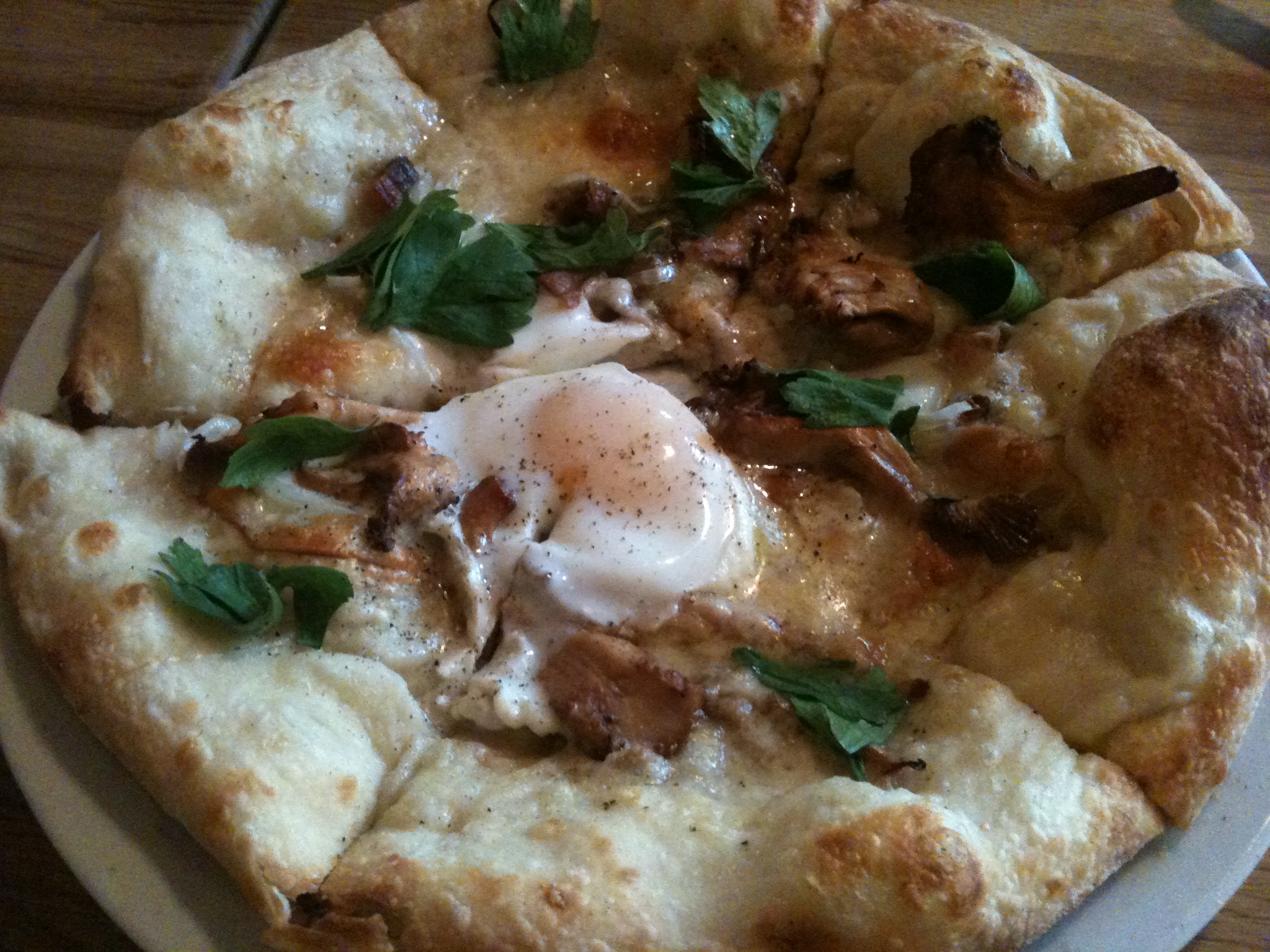Carbonara pizza with bacon, smoked provolone, chanterelles and an egg. Again, the quality of the dough more than made up for the fact I really wanted more pieces of the delicious bacon on top.