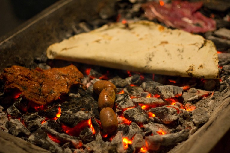 Tlayudas Libre and Dona Martha are late-night street vendors located side by side. We pulled up some stools next to the coals and put in our order.