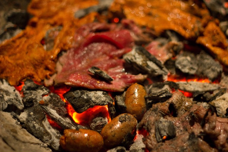 The tlayuda is smeared with asiento (pork fat), frijoles negroes (black beans) and queso (fresh cheese).The tlayuda is then folded in half and tossed directly on the hot coals.
