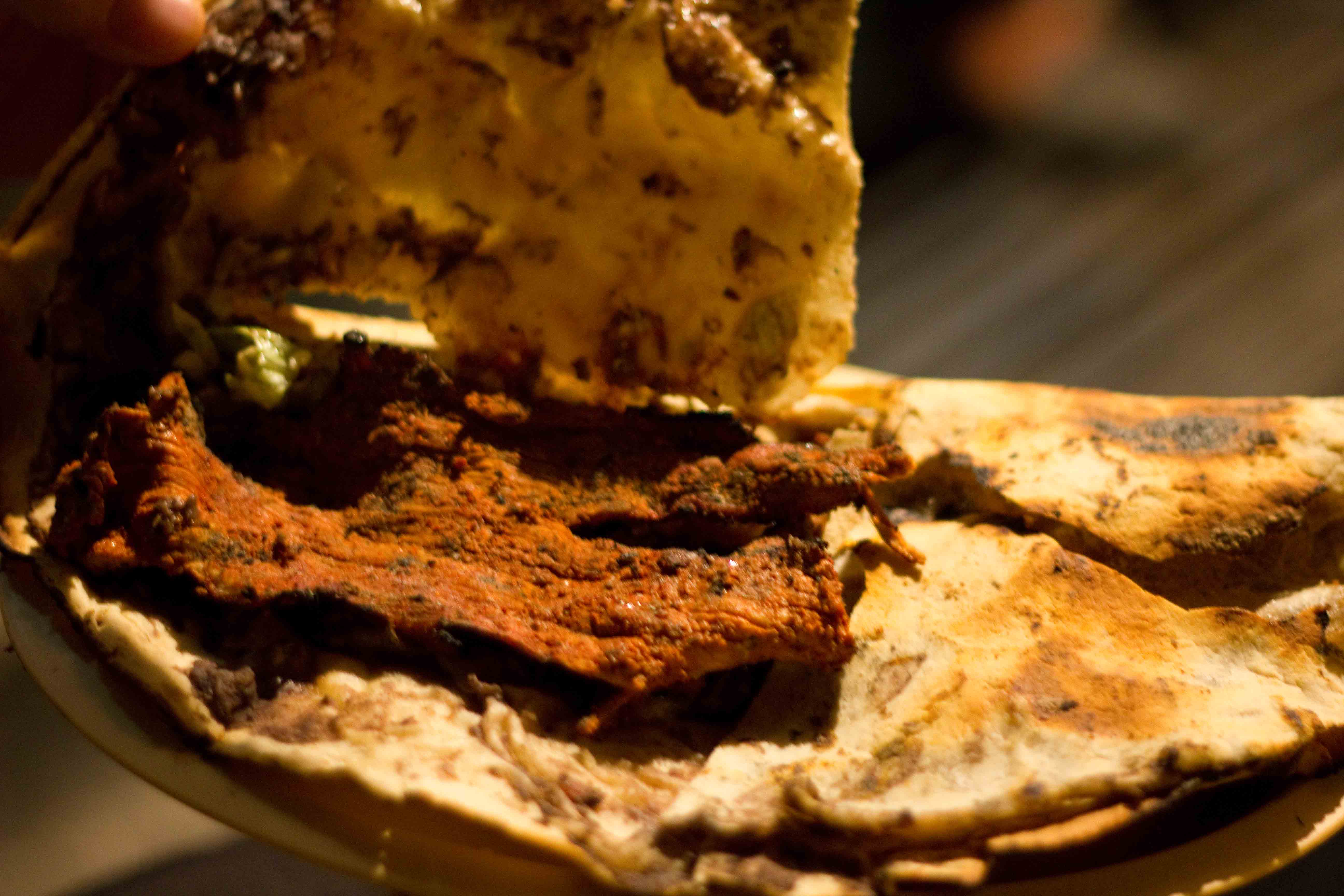 Mmmmmmmm, street meat!!!Since there wasn’t a lot of meat for the gigantic tlayuda, I put the whole piece in one half which I ate first. The combination of crunchy tlayuda with the spicy meat and smooth beans/cheese was amazing. The 2nd half without the meat wasn’t as good, but it was so big I couldn’t eat it all anyways.The verdict? ¡Muy sabroso!
