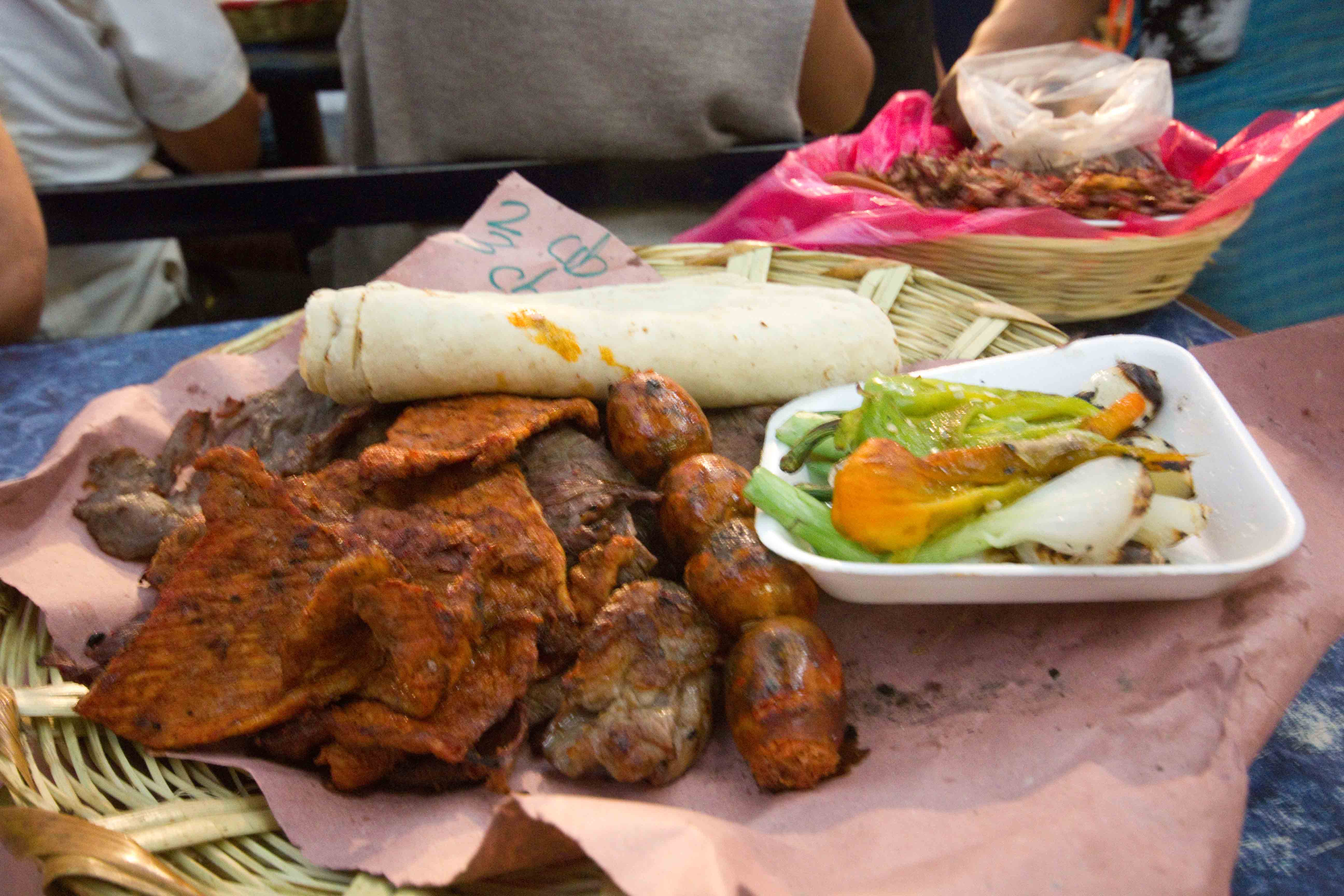 We chose the salsa, avocado, guacamole and nopales (cactus).And then came the meat. Behind our platter is a basket of crunchy salted chapulines (grasshoppers) a woman was trying to sell us.A shot of my first sampling. After this, it wasn’t as pretty.