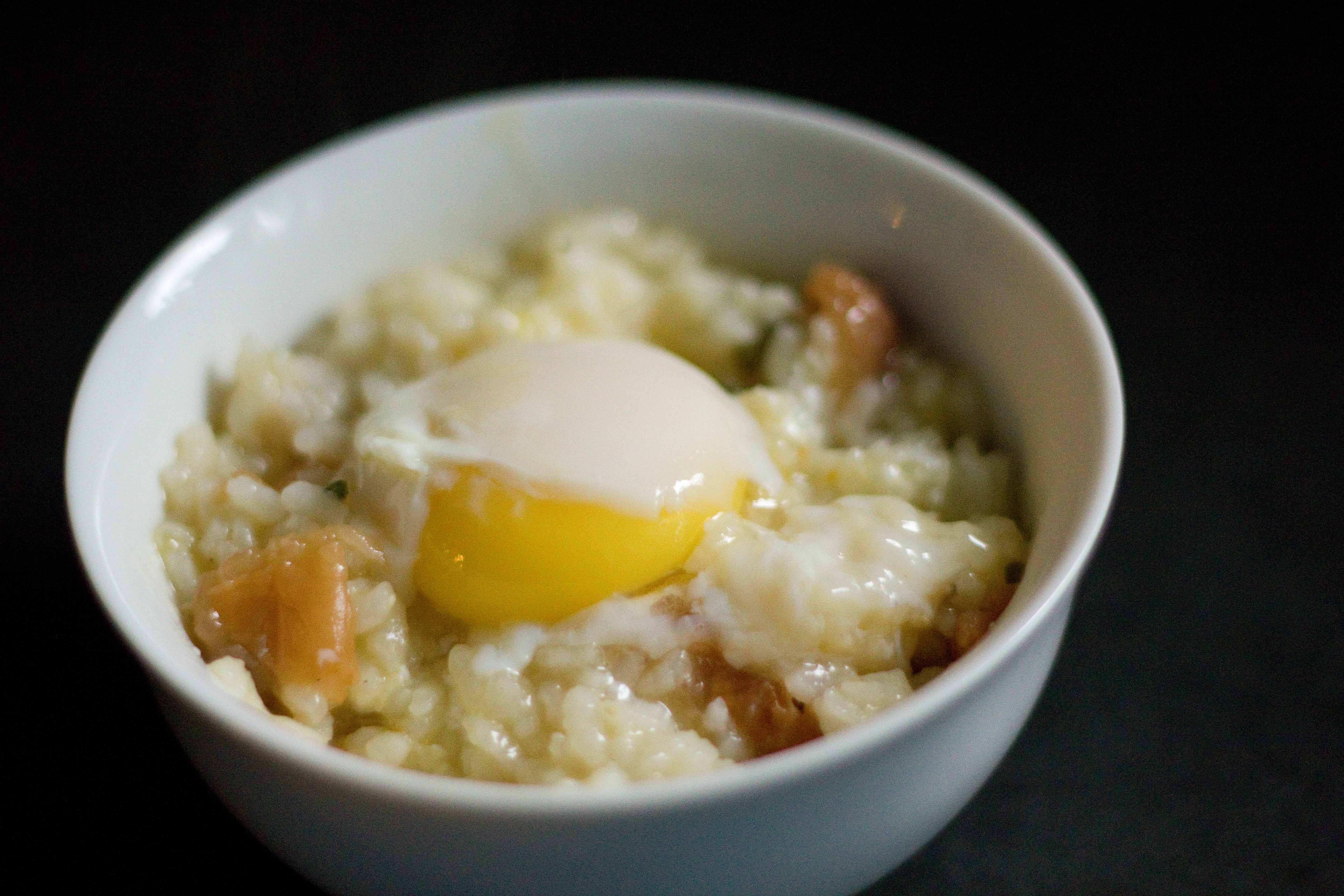 At the last moment, I crack an egg on top of the rice and let it heat through. I also tear up little bits of umeboshi (sour plum) and mix it into the bowl.