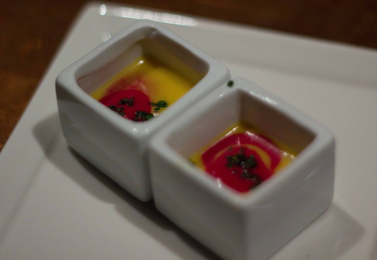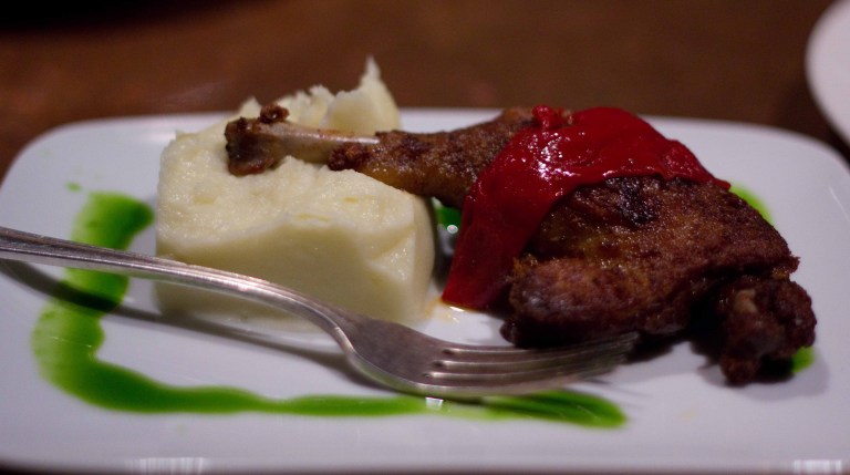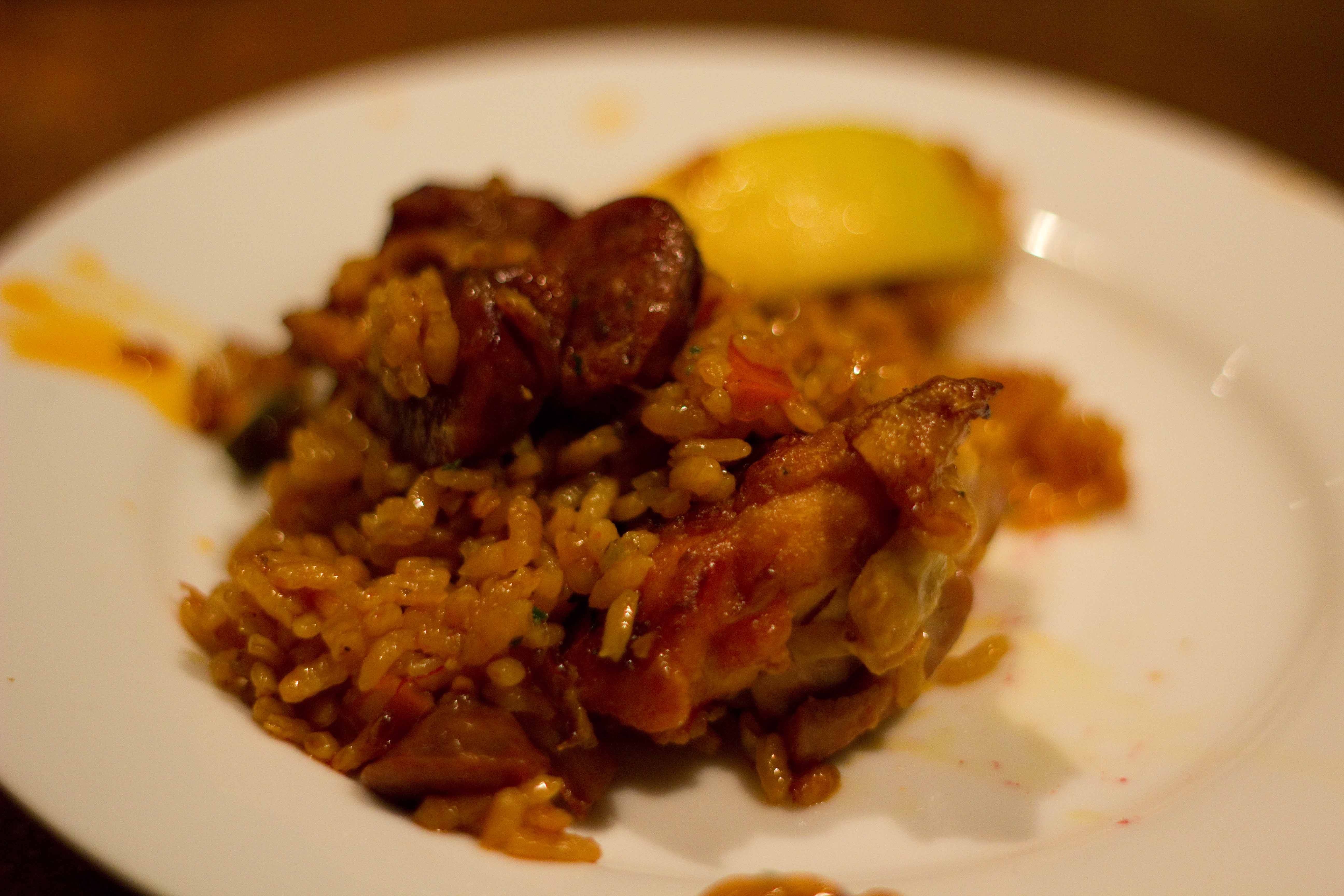 A perfect start to a great meal. This golden and red beet cold soup was a bright kiss of sunshine on a cold and rainy Seattle evening. We had a version of this in the summer and it was even more delicious than I remembered.Slow roasted cauliflower, finished in the saute pan with a hit of olive oil. Sweet, nutty and absolutely amazing!Beautiful beet salad with olive oil and champagne vinegar. This is simple, silky, sexy food at its best.Crispy duck confit with creamy luscious mashed potatoes.A bonus for us. They only make paella on Tuesdays at Harvest Vine, but we were sitting beside a regular at the bar who requested it. We drooled as we watched this dish being lovingly tended to by the chef. Since the pan was so big, we were lucky enough to be offered some. I’m now convinced that chicken really makes a paella.Another bonus of sitting at the bar is that you can talk to the chefs to get ideas of what they’re excited about. This braised rabbit leg with chocolate sauce and kale wouldn’t normally be something we’d order, but were happy with the suggestion.