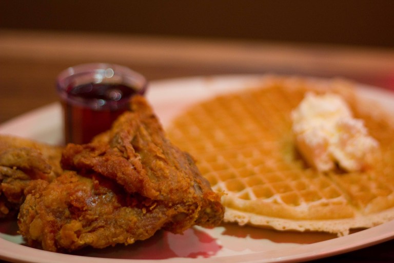 Getting out of the cab, I wasn’t sure if doing this adventure on my own was the smartest idea, the area seemed a bit rough and there were some very burly African-American guys selling “cell phones” out of the back of a van in the parking lot. But walking in to Roscoes, I knew that I was in for a treat. I felt like I had been transported way out of the LA I knew and into the world where I was a total foreigner. The restaurant was packed, and not only was I the only Asian person there, the one caucasian person immediately made eye-contact with me and gave me a nod which I took as a sign to tell me, “he had my back”, which made me giggle a bit. The smile never left, as my server Mama, (as all the other servers seemed to call her) took my order and kept referring to me as “Sugar-pie”.