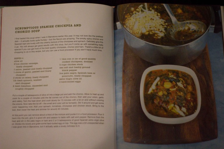 I woke up this morning thinking about chorizo and chickpea soup. It was a cold morning, so it wasn’t unusual for me to crave soup and I thought that the smokiness of the chorizo and the heartiness of the chickpeas would be the perfect combination. I knew I’d seen a recipe for this in one of my cookbooks, so I started the hunt. I narrowed it down to Jamie Oliver, but couldn’t remember which one. I spent the morning drinking coffee looking through every single JO cookbook until I finally found the recipe.