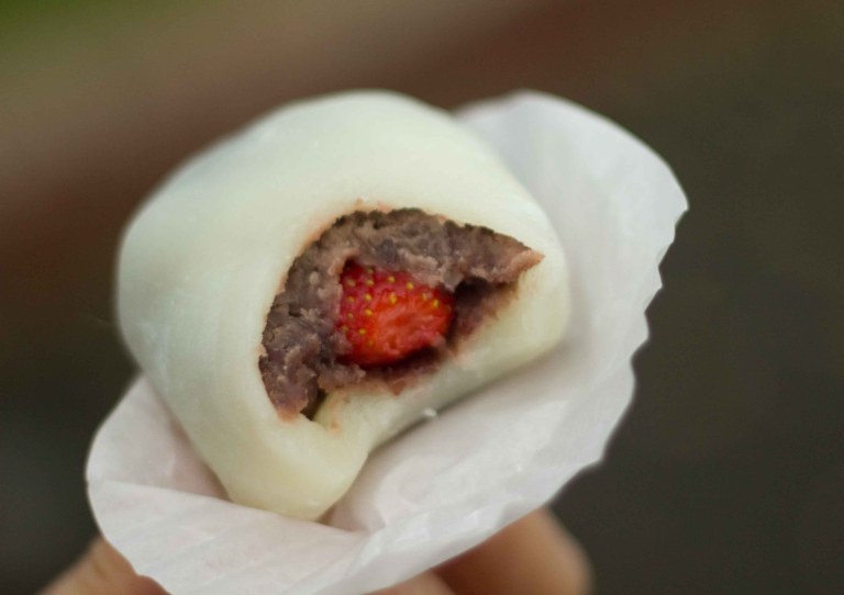 The abalone stall usually has a long line-up, but it didnt on the day I visited so I took the opportunity to suck back a few.I didnt realize that there was a assortment of condiments that I could have topped these creatures with, but they were perfect on their own! I prefer them raw, but these were only lightly grilled, so they retained their delicate taste and texture.Ichigo Daifuku (strawberry mochi) were next. As much as a food lover as I am, abalone was a bit much as my first taste of the day. This was a lot more appropriate.Made up of sweet glutinous rice, sweet red bean and a kiss of Hawaiian strawberry, I cant help feeling like a kid when I eat this, (although I hated the red bean part as a kid).At this point, I needed to take a break from eating, so I strolled around the market to delight in the colourful bounty of Oahu.