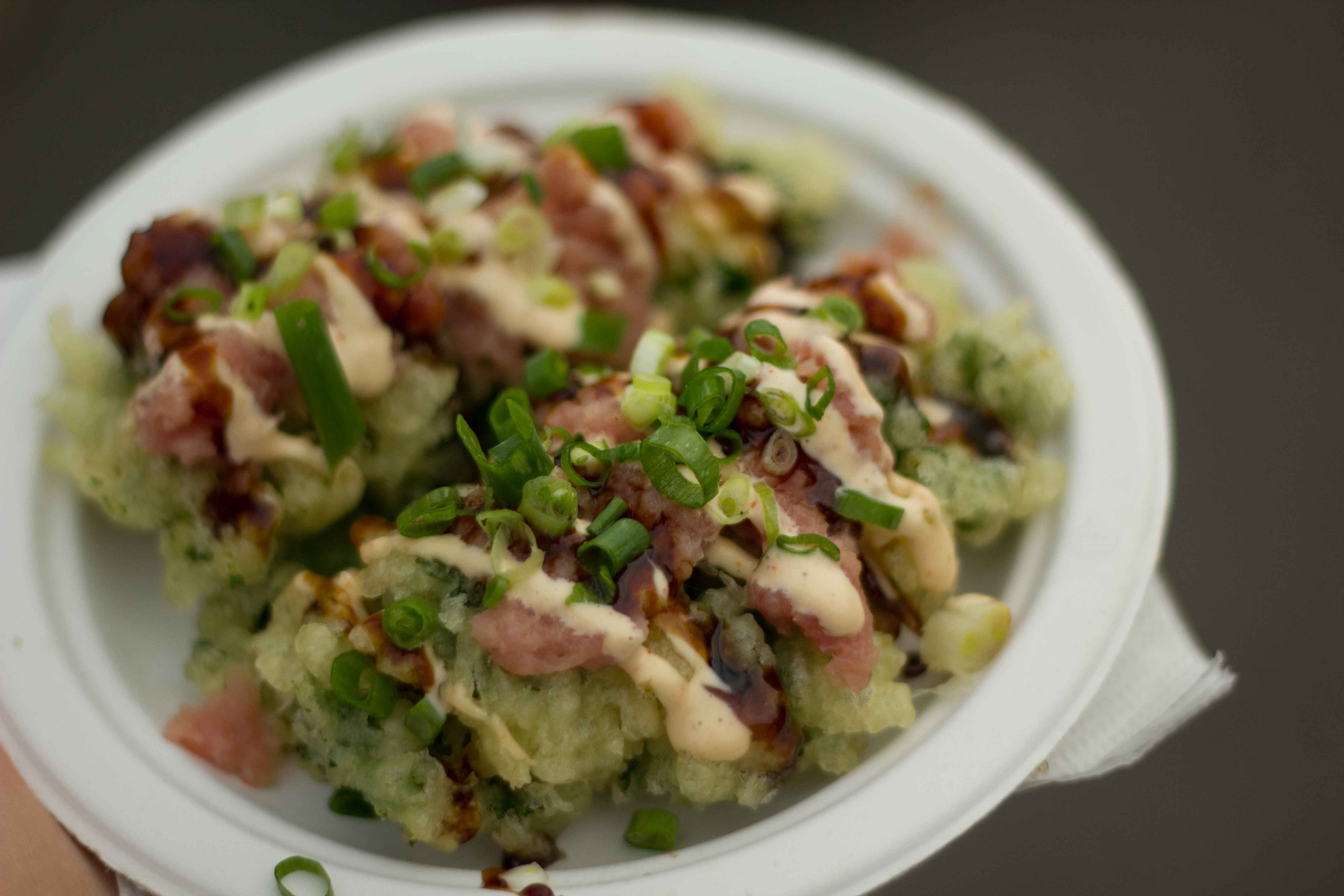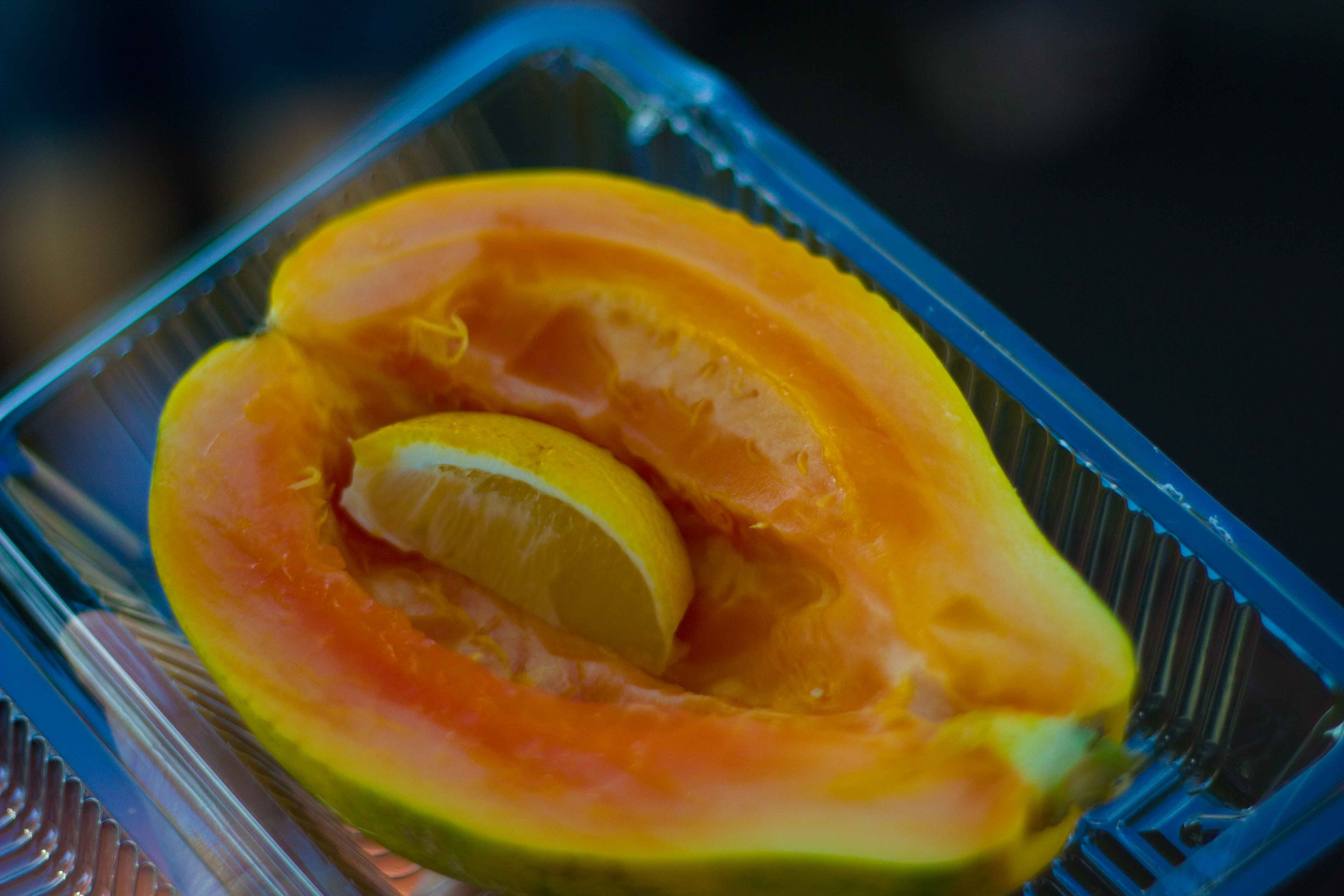 It wasnt long before I became distracted by the food again. These sushi surf sliders made of ahi tuna topped tempura kale was very unique. The sturdy, yet lightly fried kale was a wonderful vehicle for the generously sauced ahi tuna.In between buying food, I did some sampling as well. I wasnt going to bother with the long line at Pacicikool, but since theyve closed their Waikiki beach stand I knew this was my only chance of getting their ginger cooler. Ive tried replicating this at home, with homemade ginger syrup, lemon, basil and carbonated water but its never the same. Maybe being in Hawaii makes it taste better.I couldnt leave the market without having some sweet papaya with a squeeze of lemon!