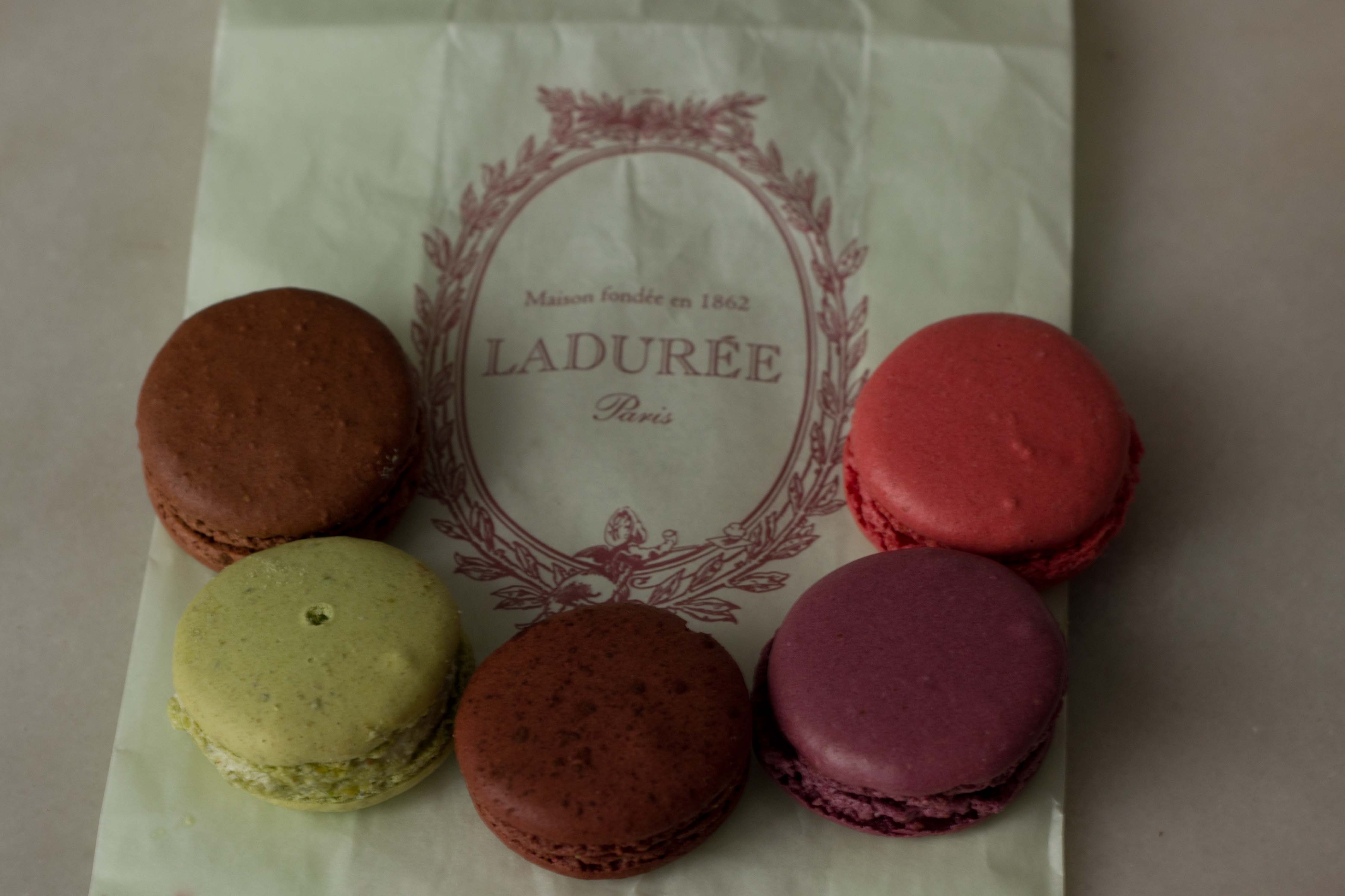 Fighting jet lag on my first morning, I wandered out on the streets a bit before 8am only to find that none of the bakeries were open. I did pass by a McDonald’s Café which displayed these fabulous looking treats. As much as I wanted to try a macaron, I knew that I’d be doing my search injustice by setting the bar so low.Pain de Sucre has 2 shops – 1 for baked goods, the other for sweets. Both were a block from my apartment = regular visits to both.The pistachio macaron, (on top) is my favourite flavour and thus the standard for judging. This was as good as the best macaron I’ve ever had. It made me worry a bit. Did great = great and was I going to be able to judge “best ever”?Of course Ladurée was a must. Often dubbed “the best macaron in Paris”, I found the hoity toity attitude of the salespeople combined with the hoards of tourists a bit off-putting. But are their macarons worth the hype?I scarfed the pistachio one down immediately and was very impressed. I thought these were also amazing. But hands above more delicious than anything I’ve ever had? Probably not.