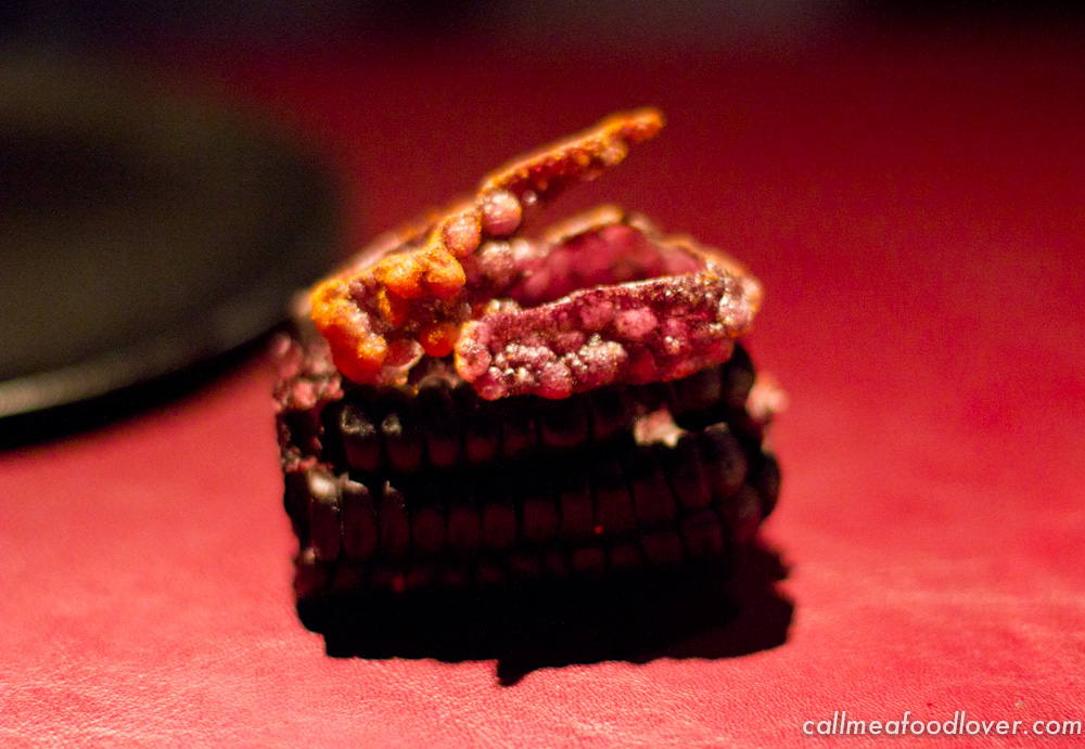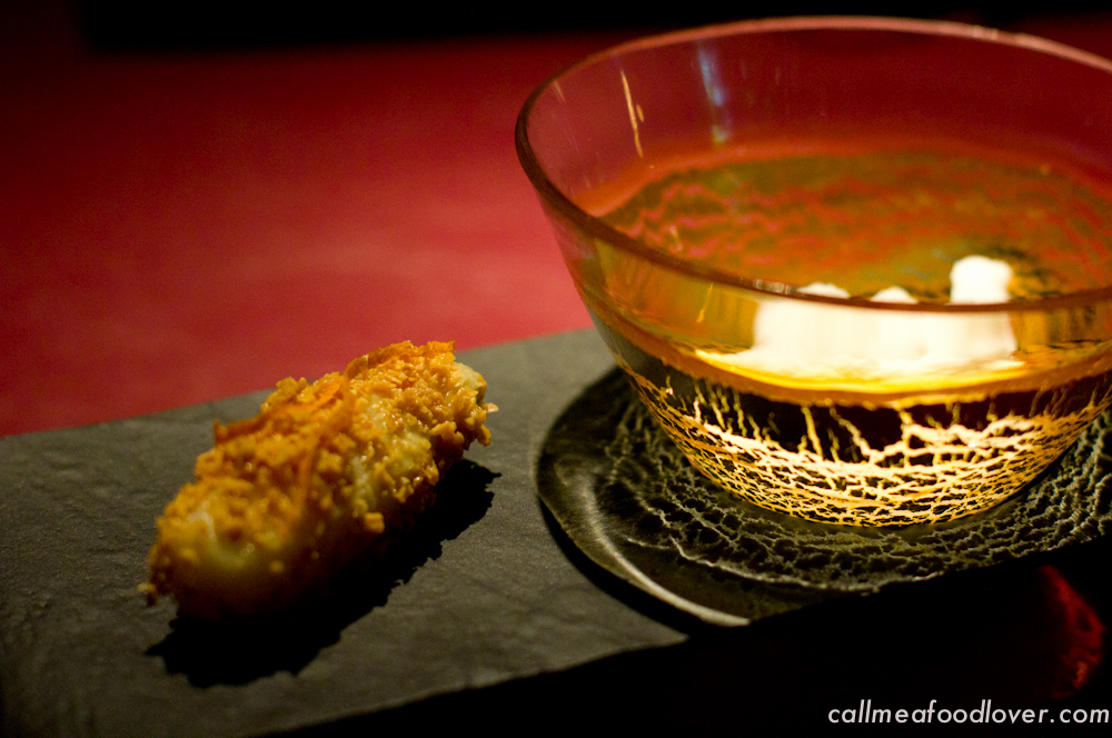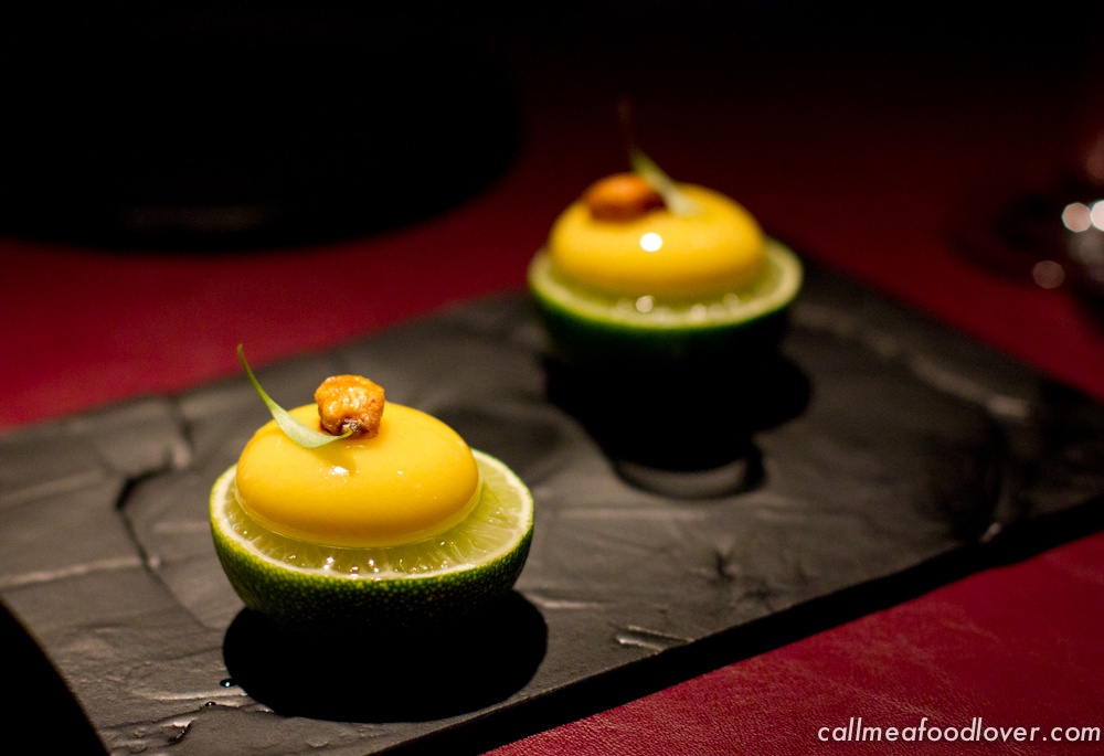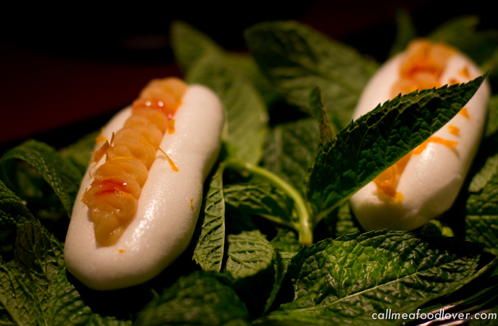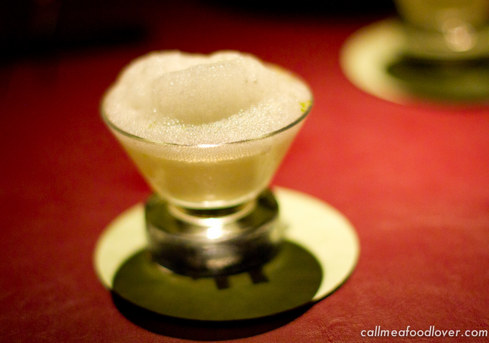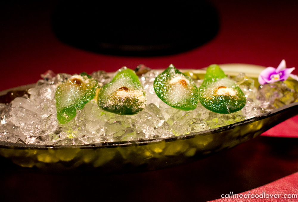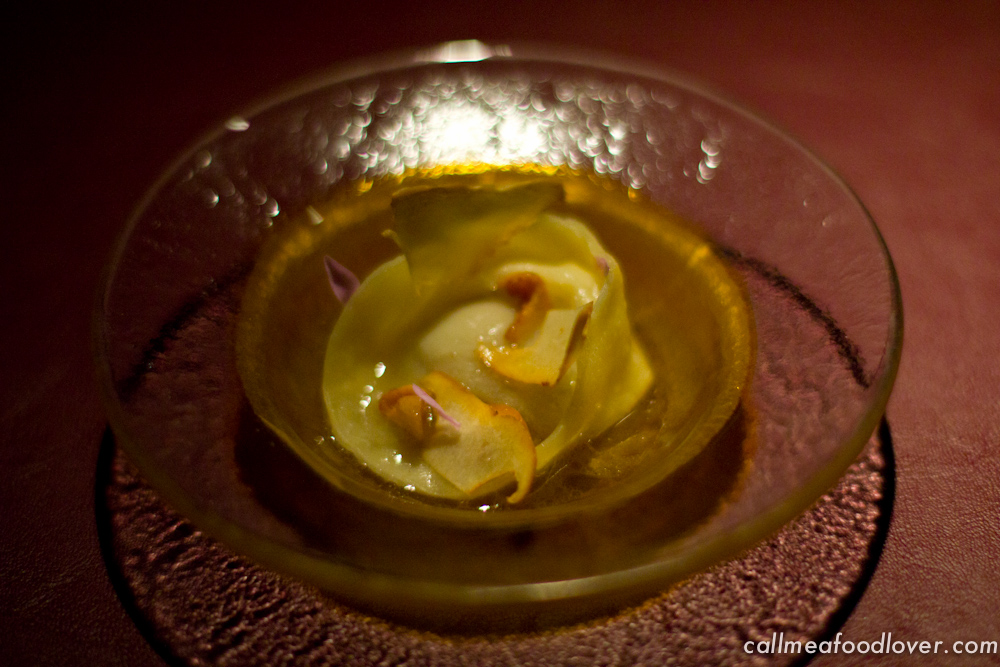 Liquid ravioli was one of Adria’s revolutionary creations. This dish was the most fun to eat as you slid the ravioli into your mouth, while squeezing the lime. The combination of intense sweet corn and lime had us all smiling and nodding around the table.