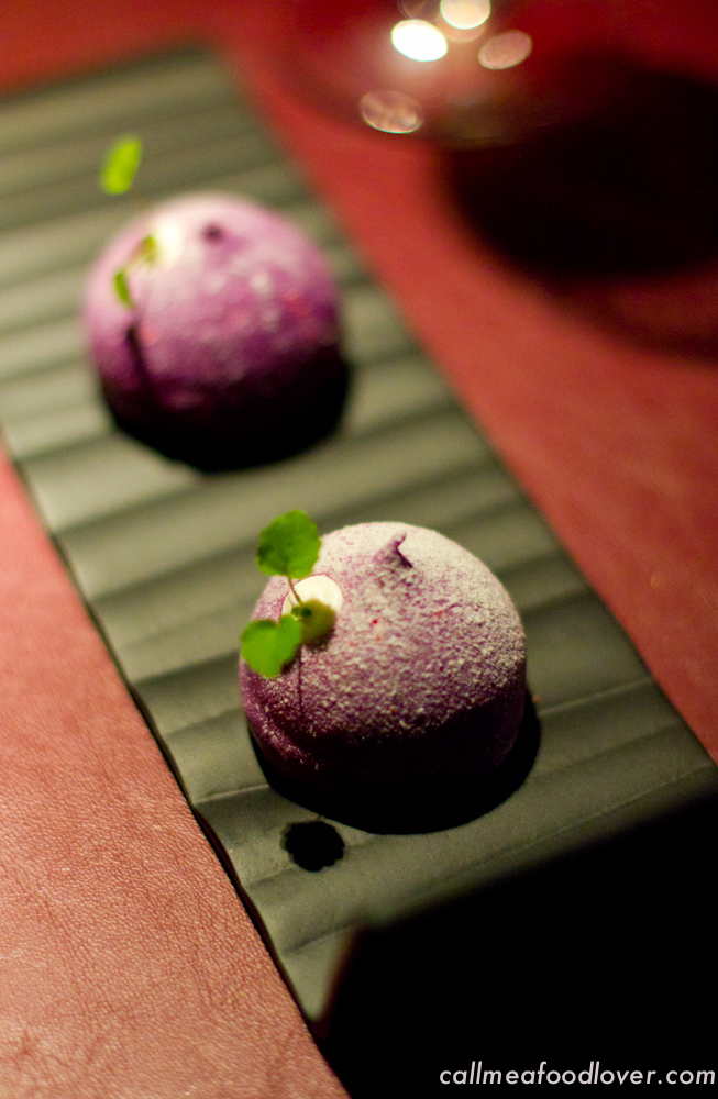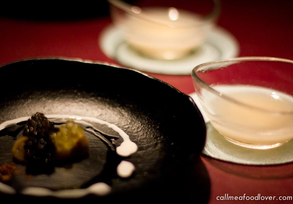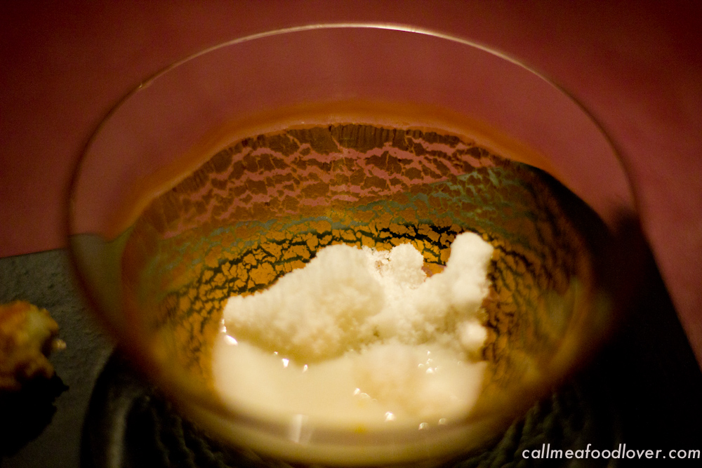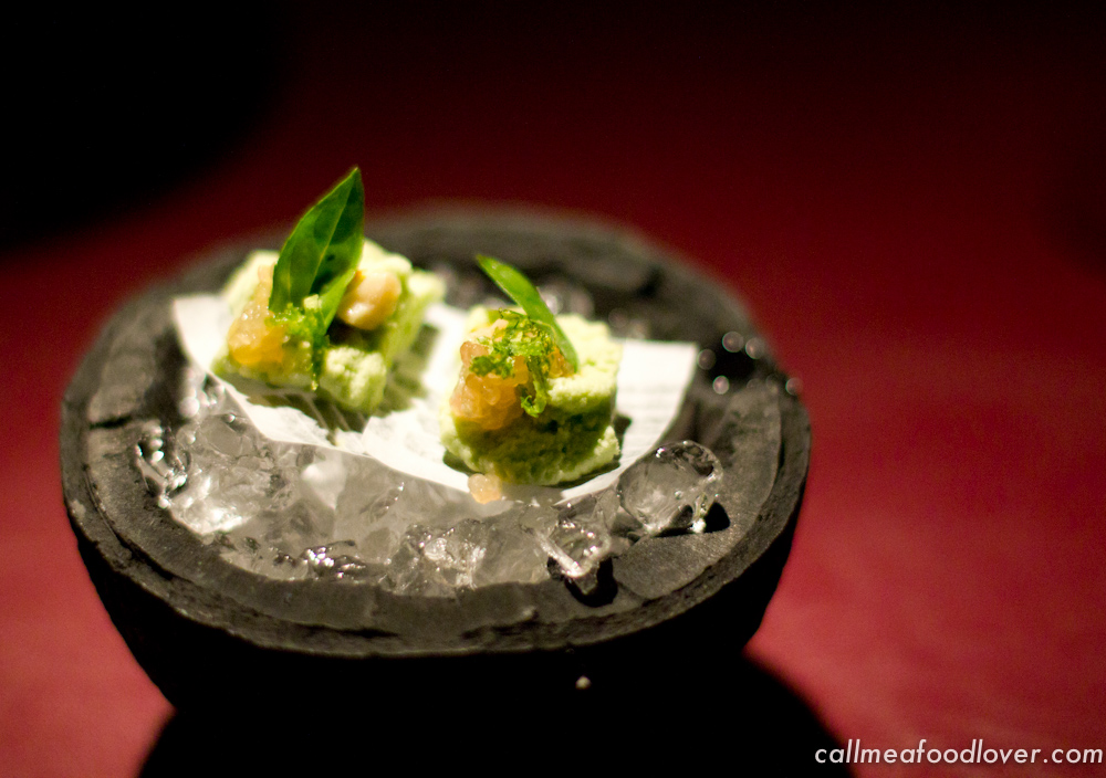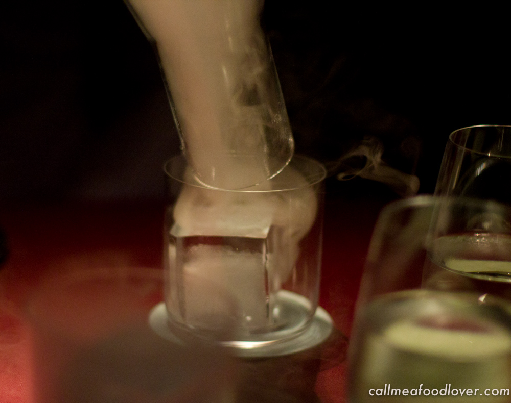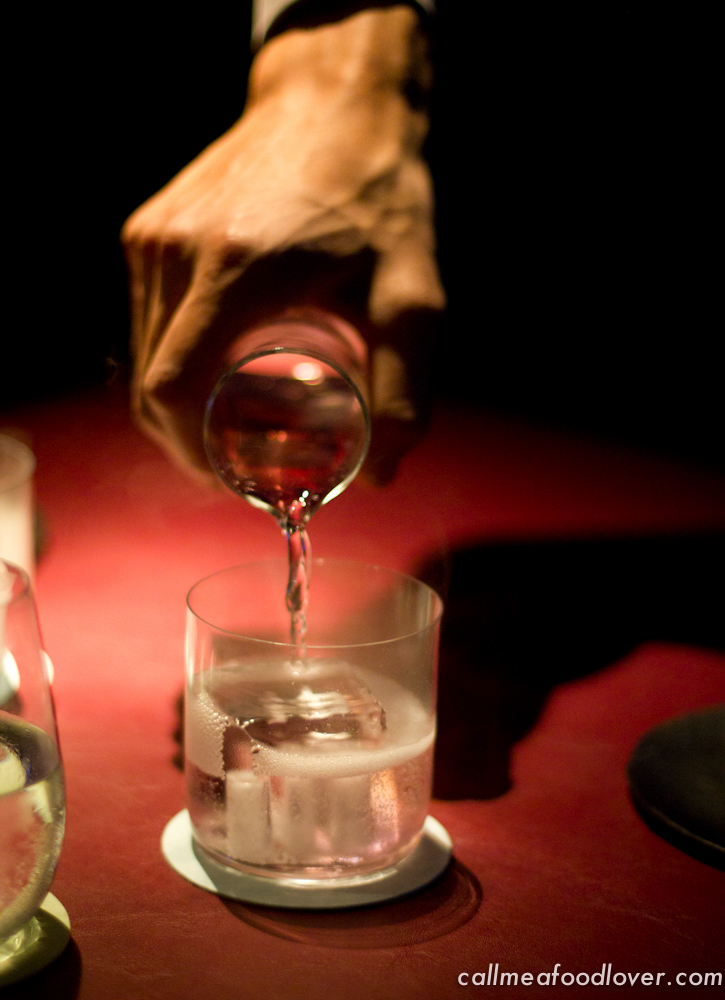 1. Yes! The cocktails were fantastic. I was trying to find a picture I took of my cocktail… but my husband seems to have taken the pictures off his phone (yes, we forgot our camera at the hotel before that evening… I was killing myself because everything was so photo-worthy!). I had this red shiso and apple tobacco concoction. The drink was served tableside and there was this enormous decanter/vial of pink smoke that was “poured” through my drink. Delicious!