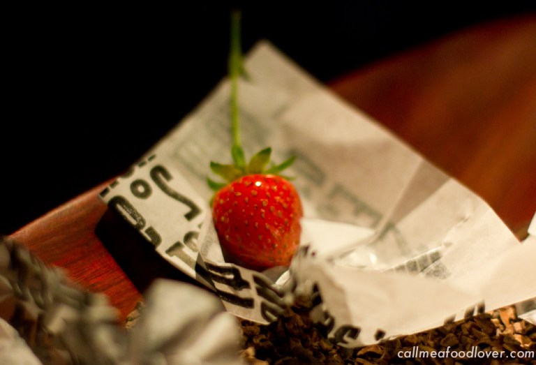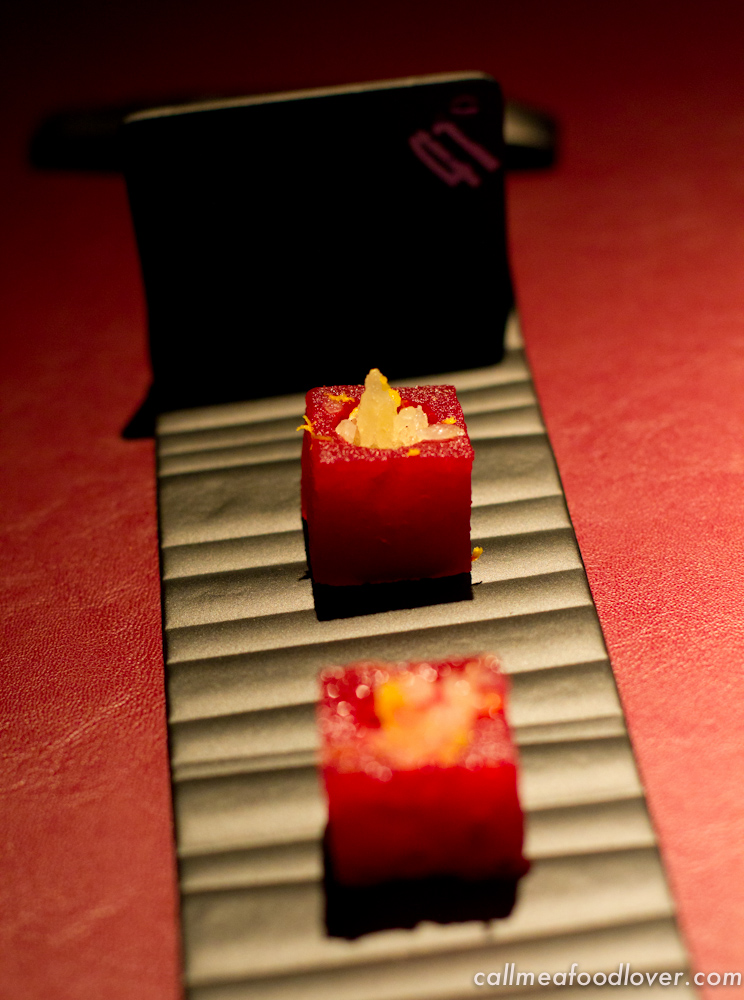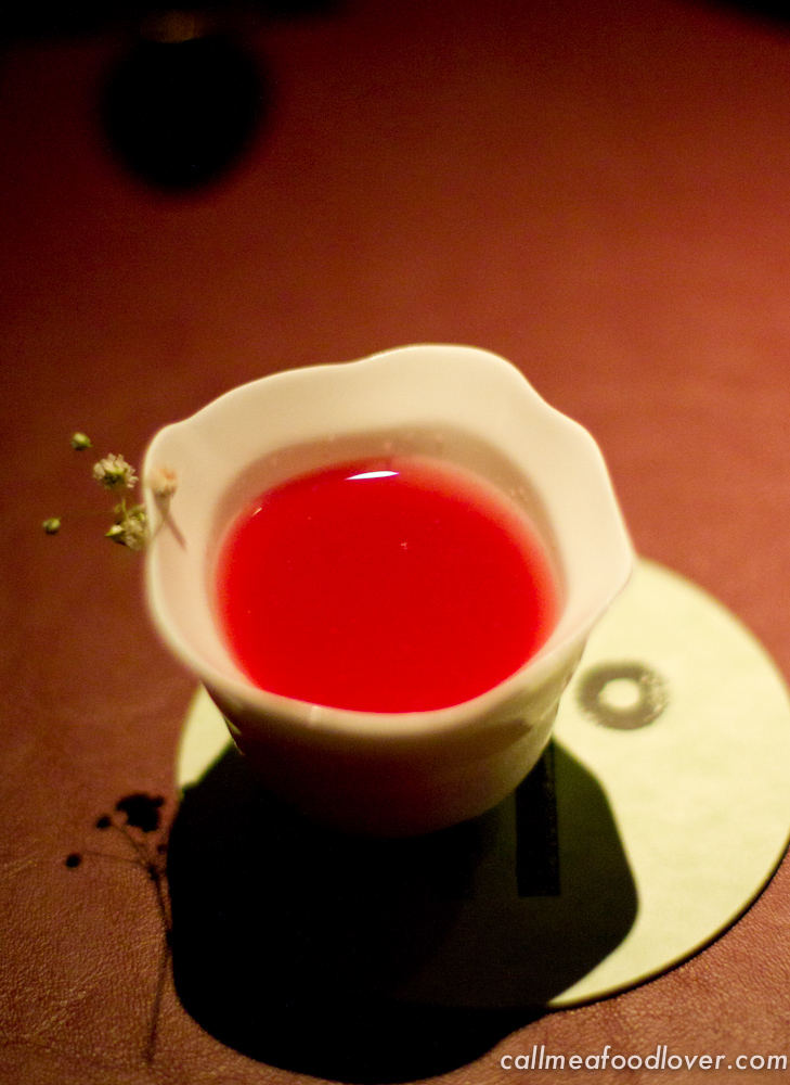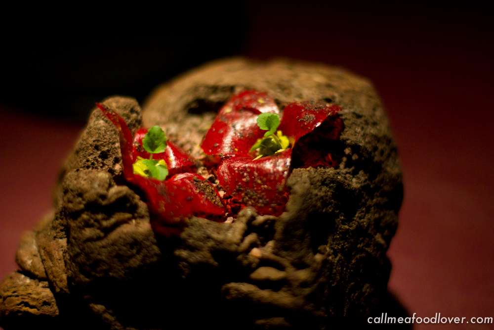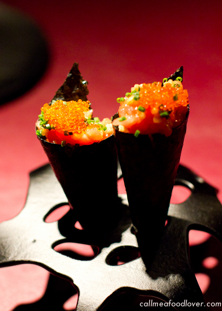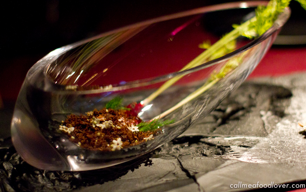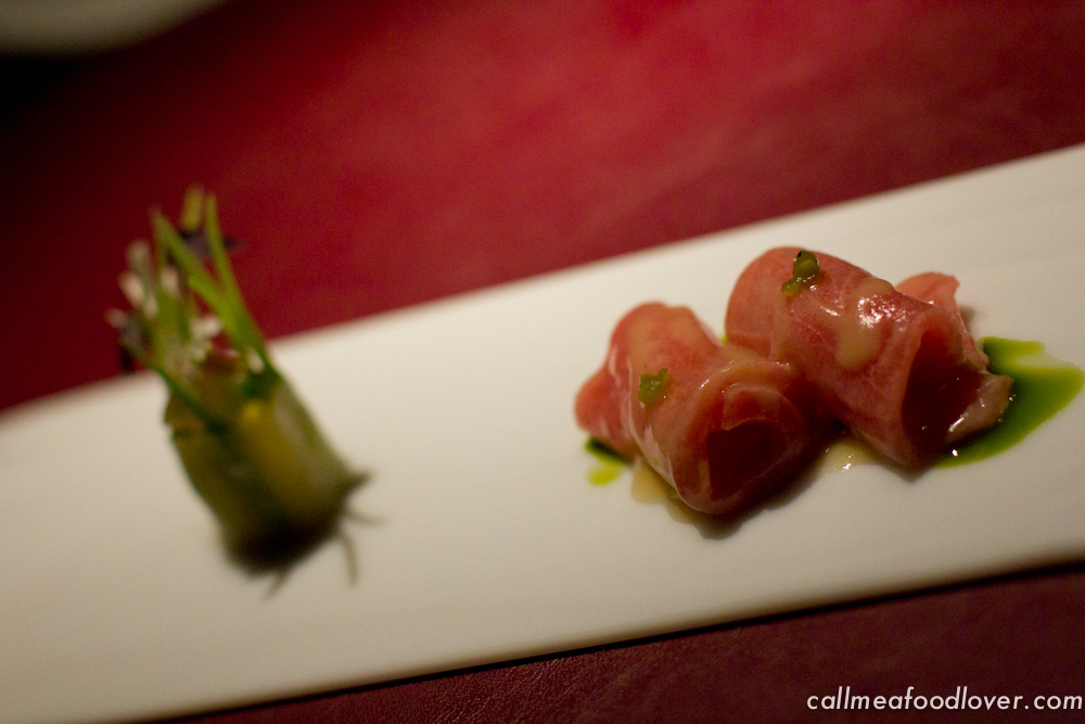 1. Yes! The cocktails were fantastic. I was trying to find a picture I took of my cocktail… but my husband seems to have taken the pictures off his phone (yes, we forgot our camera at the hotel before that evening… I was killing myself because everything was so photo-worthy!). I had this red shiso and apple tobacco concoction. The drink was served tableside and there was this enormous decanter/vial of pink smoke that was “poured” through my drink. Delicious!