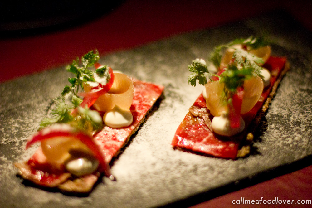 Carpaccio of Kobe beef topped with pickled onions on rye bread. Another one of my favourite 2 bites of the night.