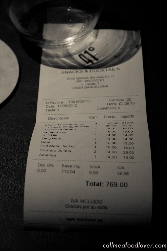 2. Sorry, I realized I never replied. I found that we probably ate more at Tickets than we did at 41 degrees but it was way less expensive You can see everything we at at both Tickets and 41 degrees. At Tickets we had 2 drinks each plus food and the total for 2 was 160 Euro. At 41degrees, between the 4 of us, we shared a inexpensive bottle of cava, had 2 drinks each and then food for 770Euro. At 41degrees, it’s all about the “experience”. The plating, presentation and types of dishes are at another level than at Tickets.