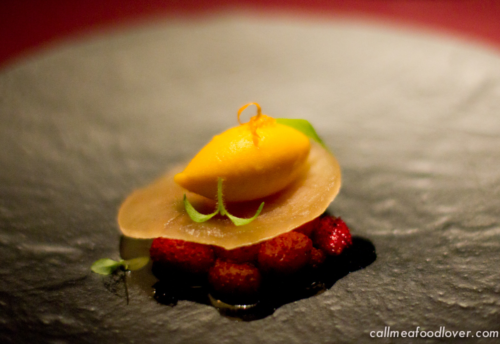 “Simple” mango sorbet and wild strawberries + a complex solid sherry vinegar round = a great marriage of sweet and sour.