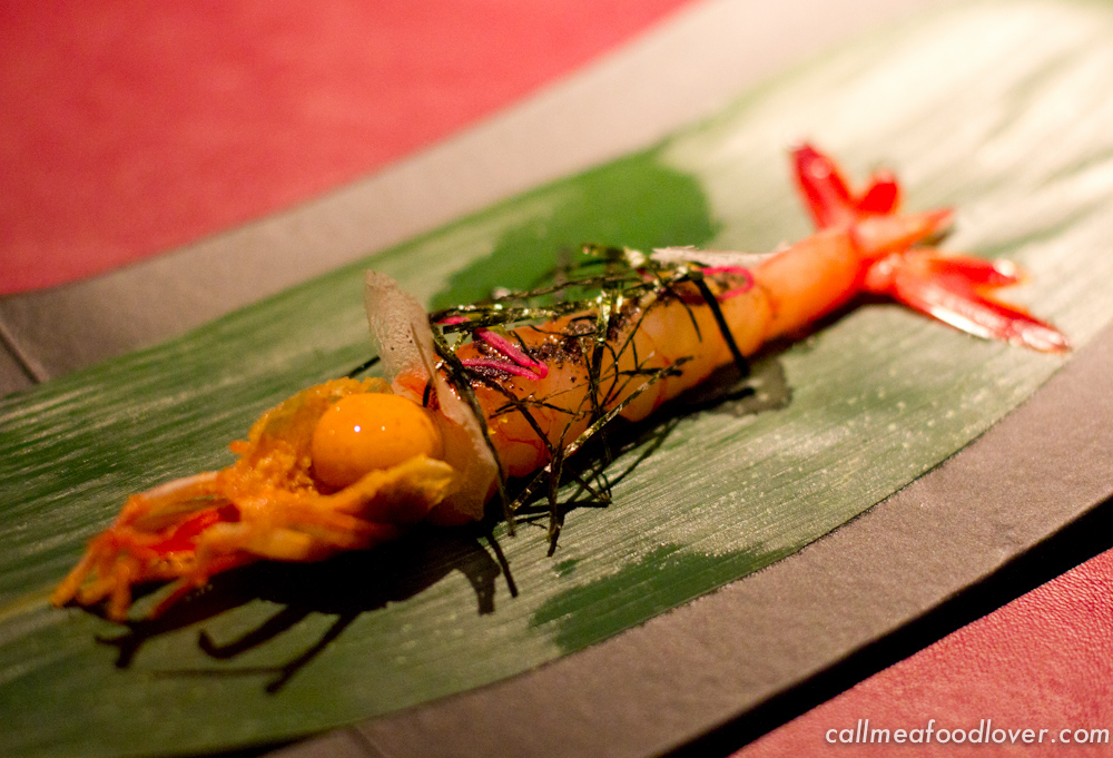 Barely cooked prawn, which still looked raw, sprinkled with nori and shiso, the miso pearl on the fried head was made of concentrated prawn head juices. “Head suckers” know how delicious this is.