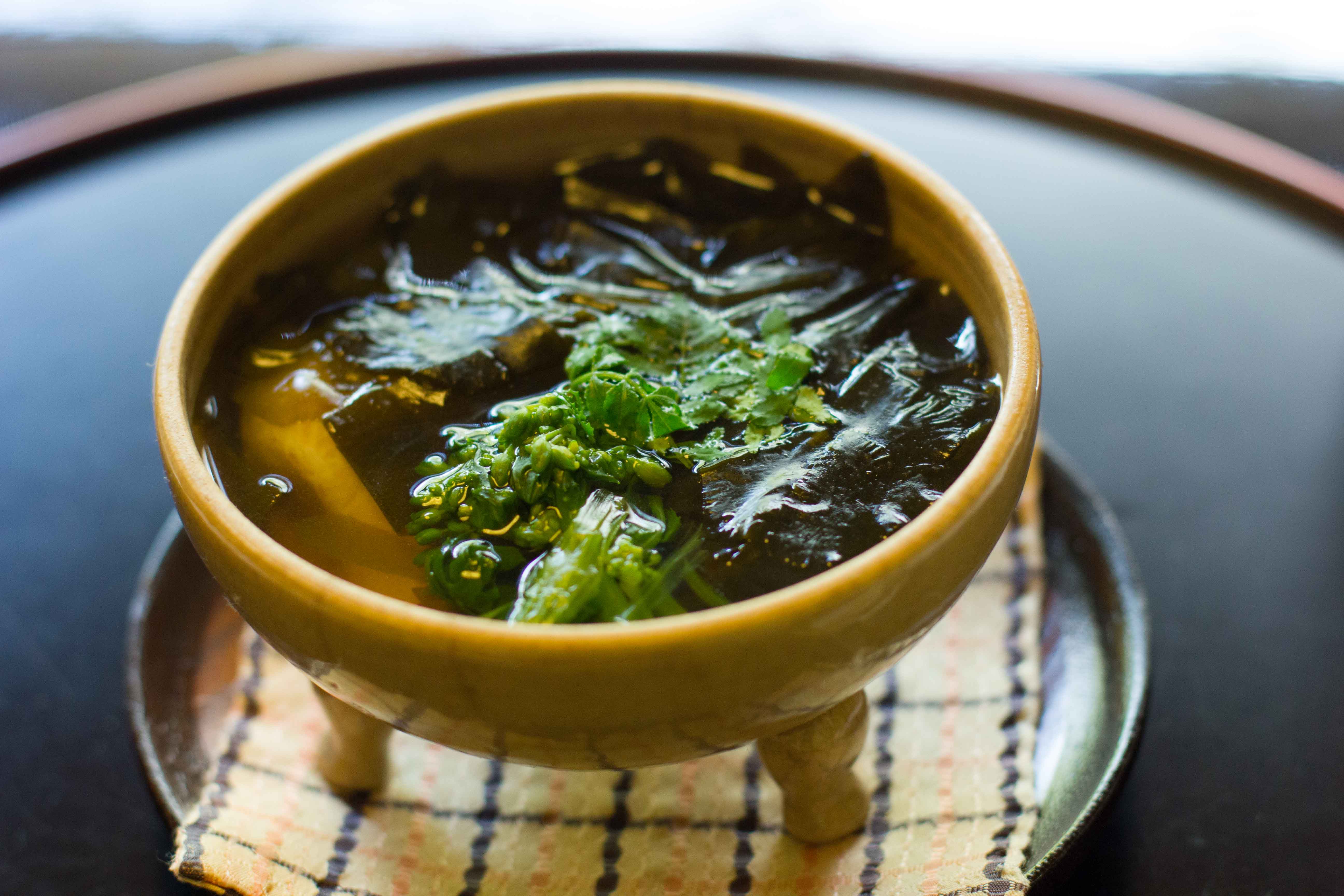 Salad of vinegared mozuku seaweed, shredded mountain yam, shoot of angelica, ginger