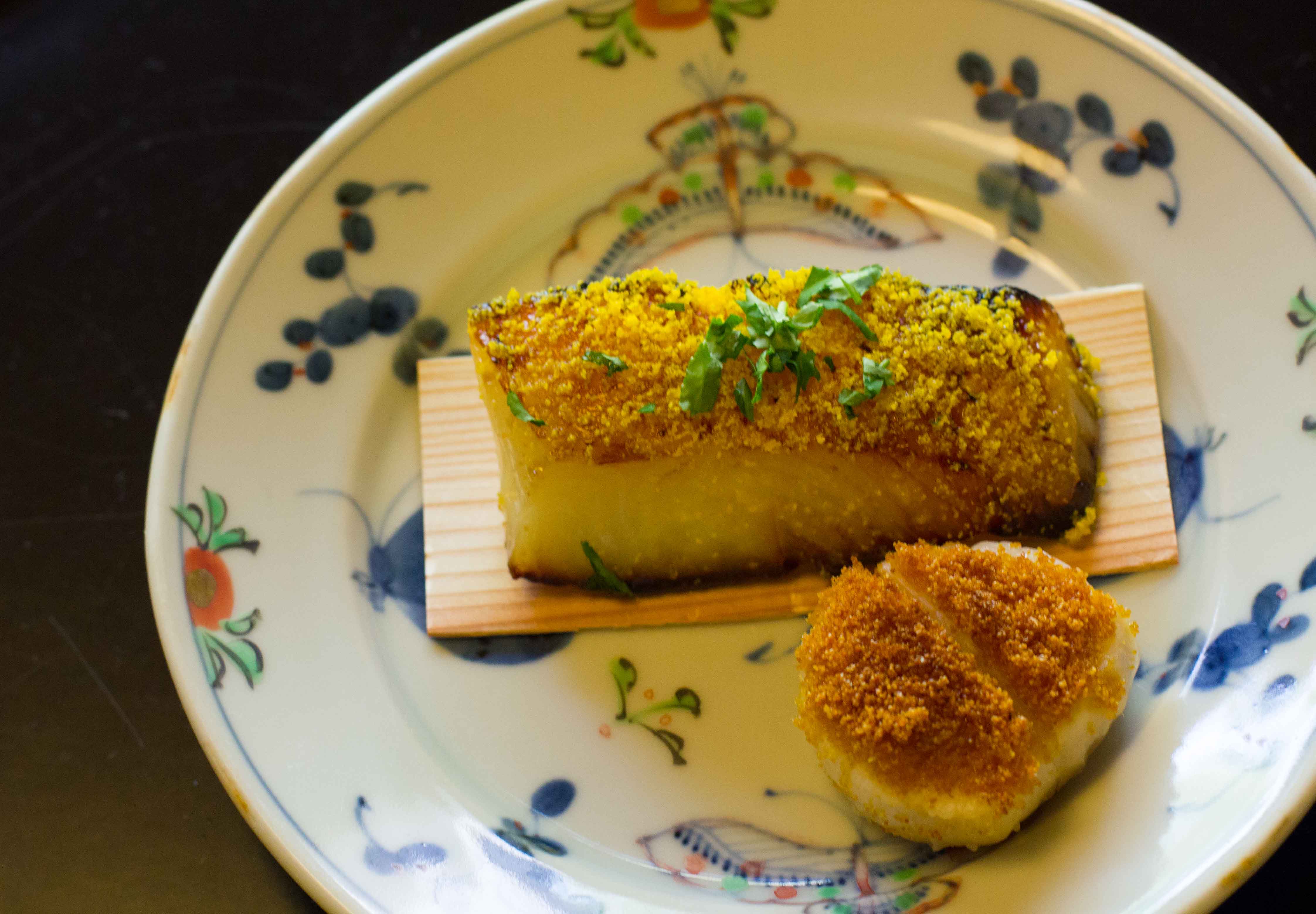 Steamed Wakasa tilefish, sticky rice, bamboo shoot, cherry leaf, toasted rice crackers, ginger juice.