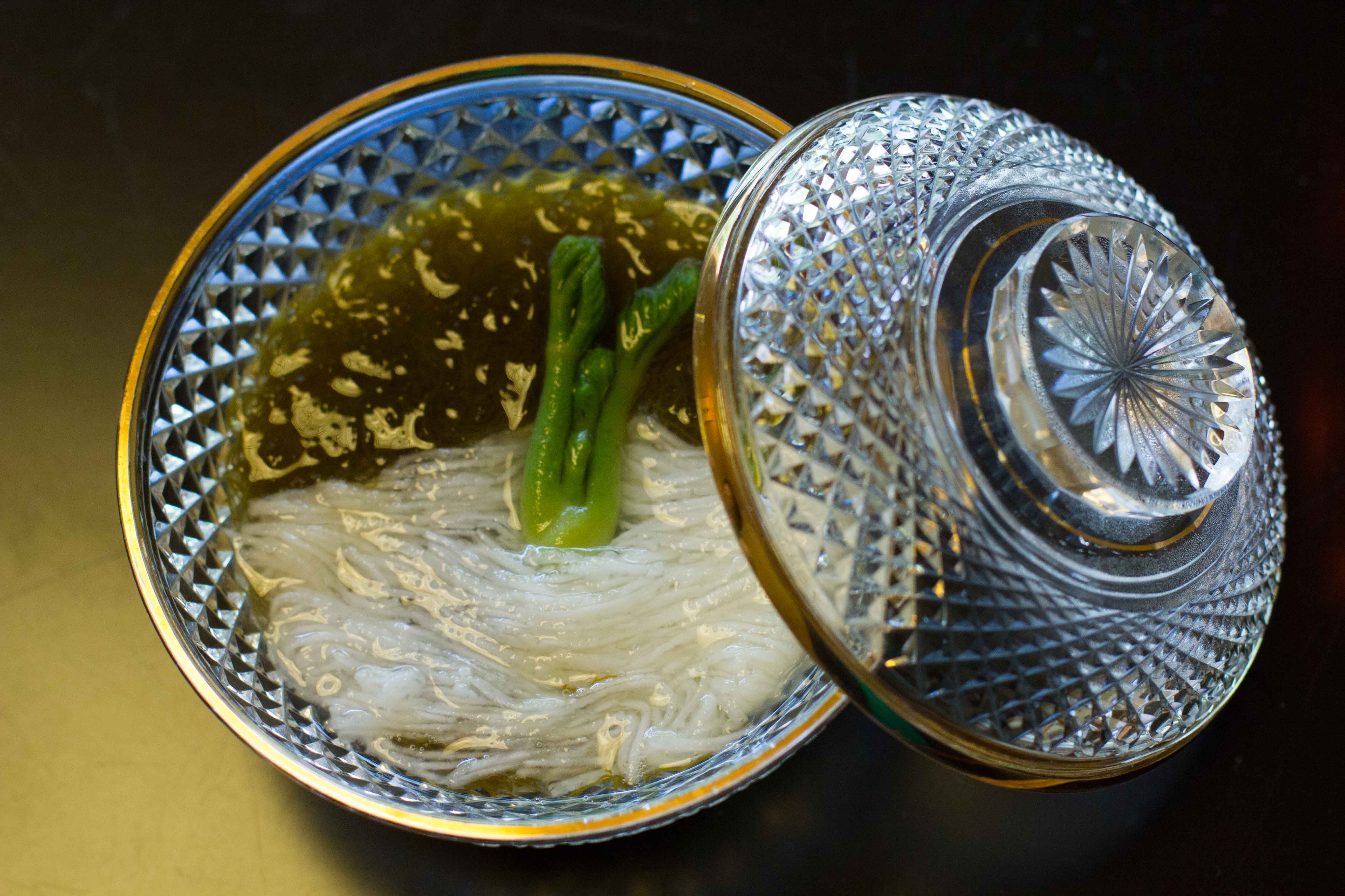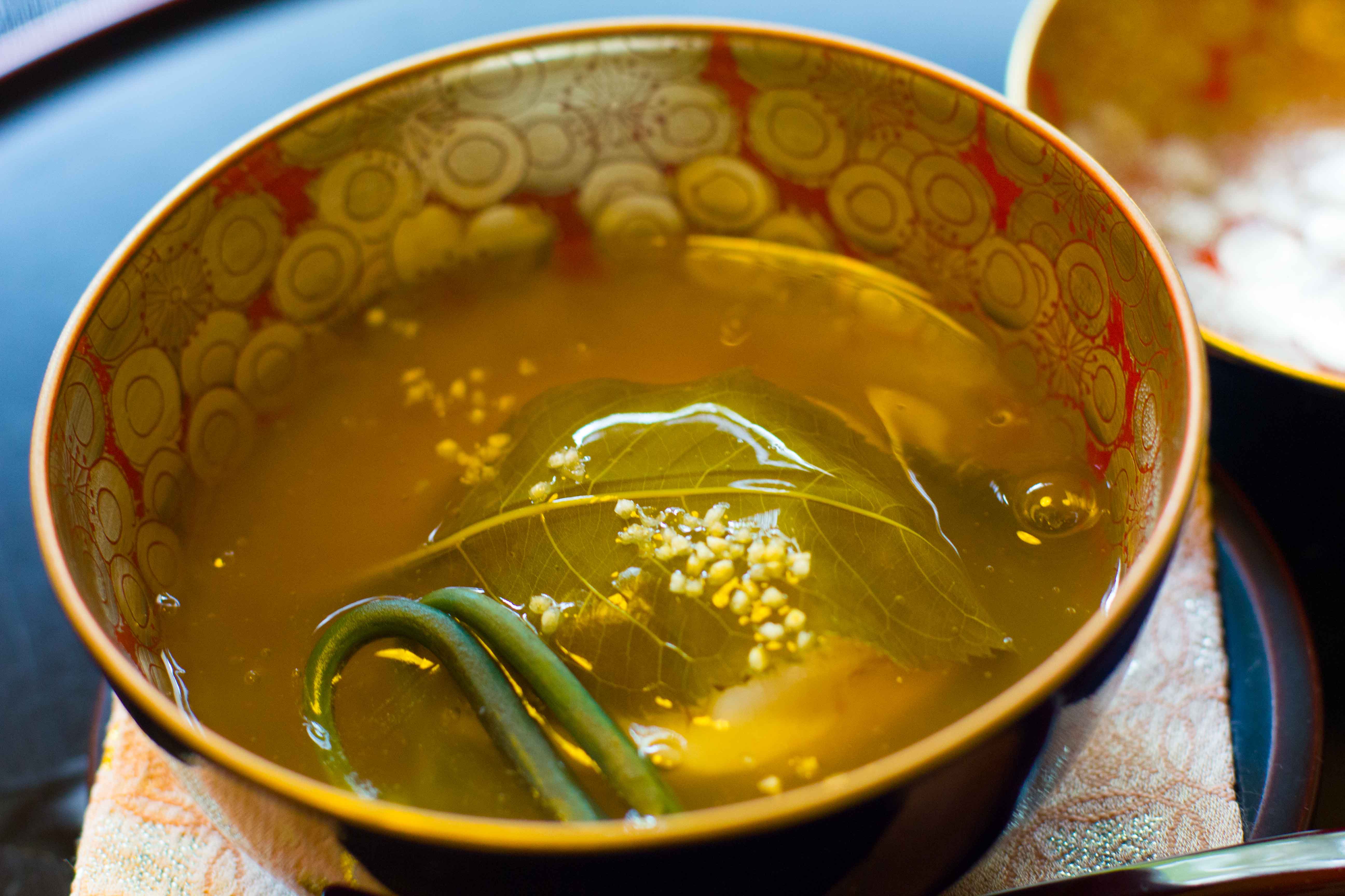 Steamed Wakasa tilefish, sticky rice, bamboo shoot, cherry leaf, toasted rice crackers, ginger juice in a gelatinous dashi.