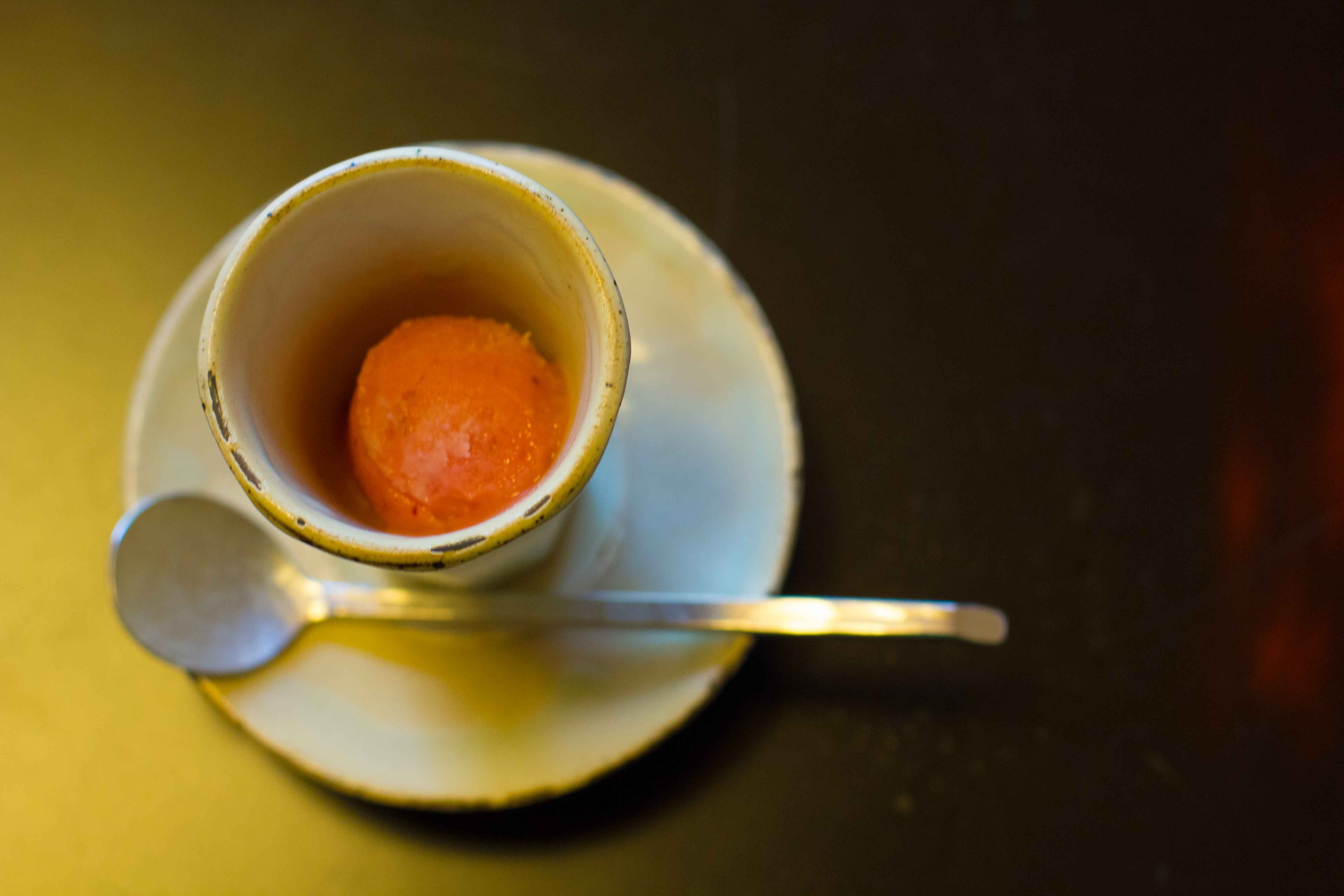 Strawberry-wasabi sorbet – a bit surprised to see sorbet used as a palate cleanser. Is sorbet traditional Japanese?