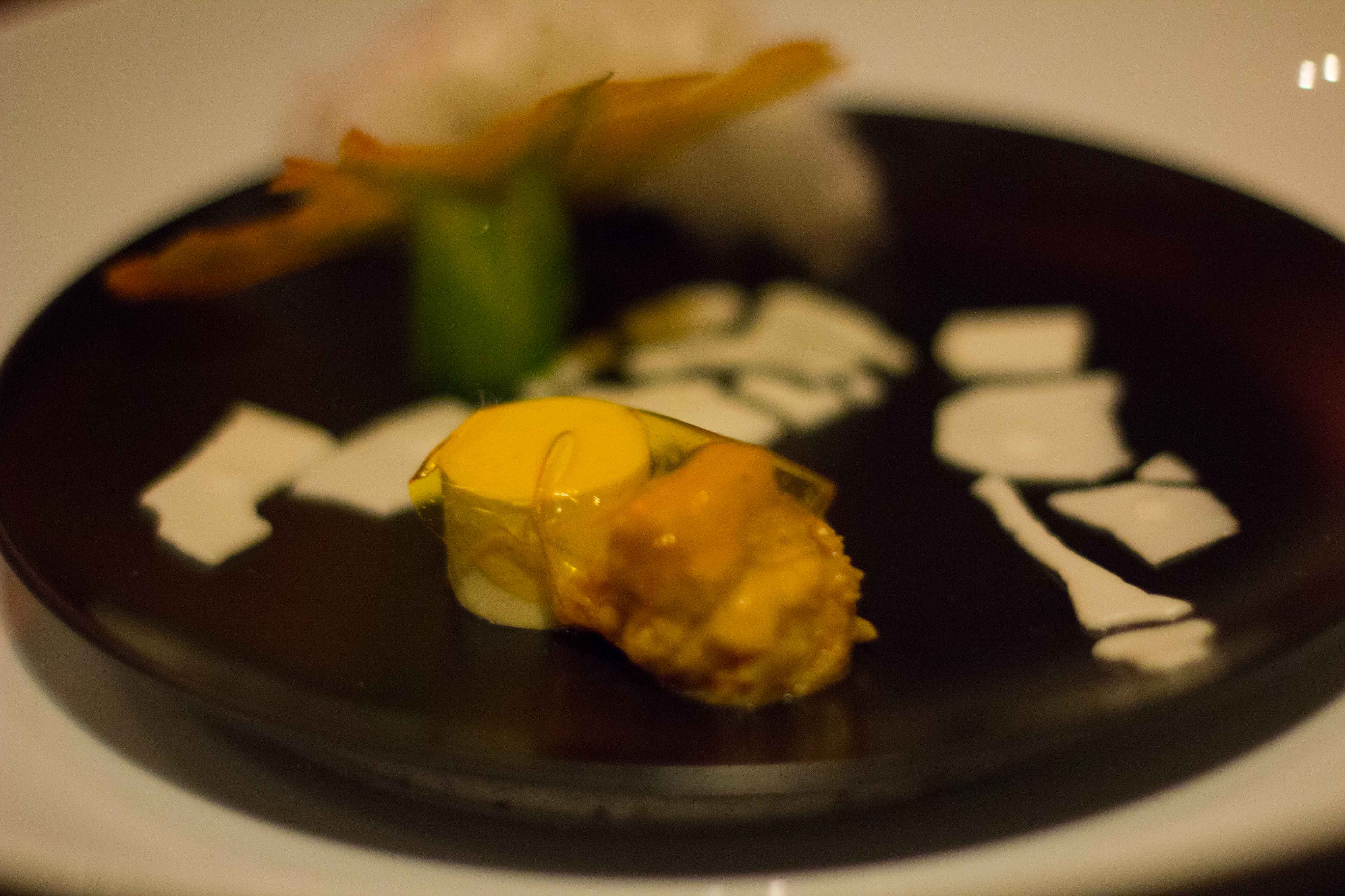 Dungeness crab with squash blossoms, cardamom and saffron.