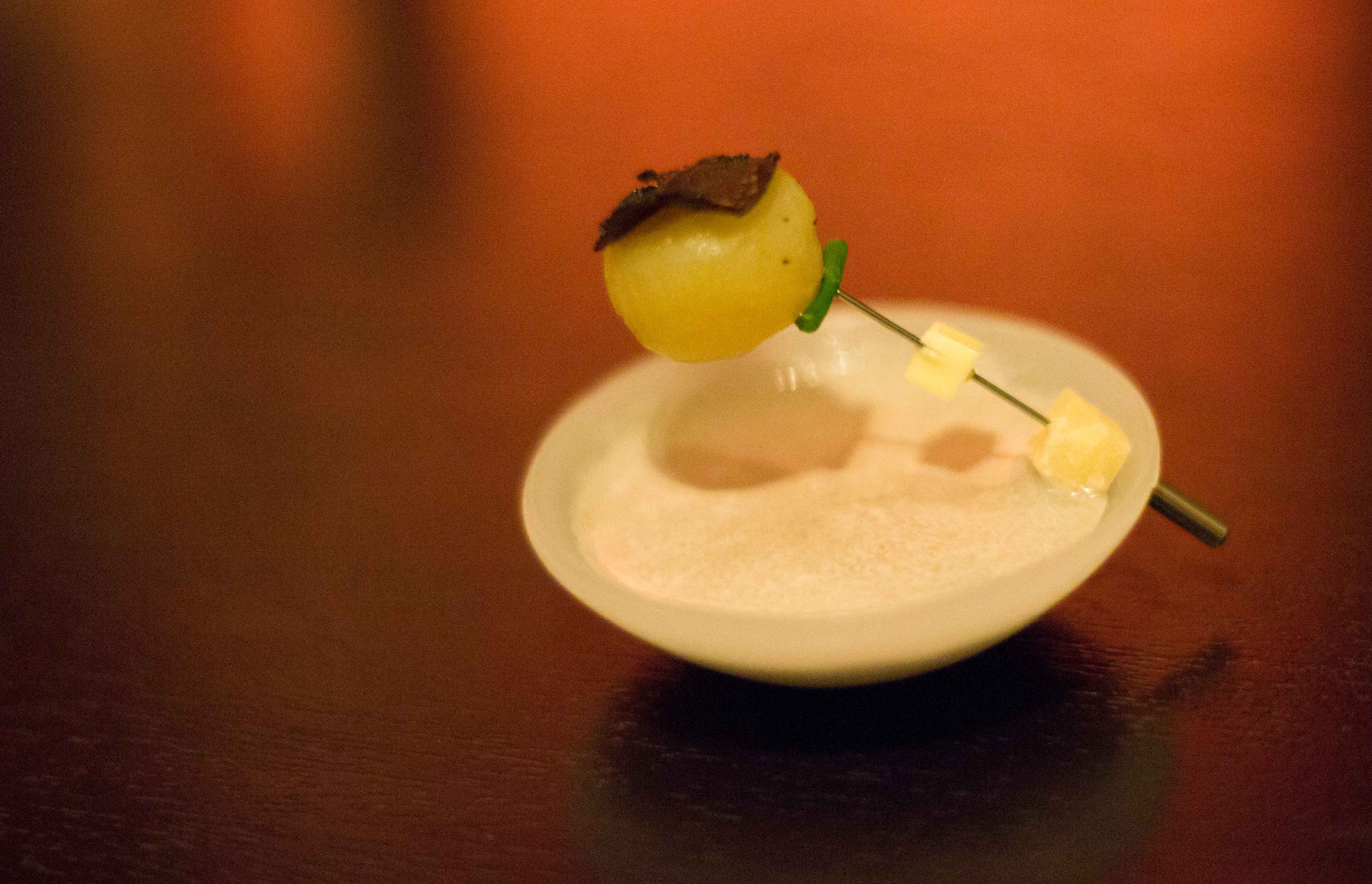 Hot potato, cold potato with black truffle and butter. My favorite dish of the night in execution, taste and presentation. Pull the pin and the hot potato falls into the cold potato soup. Brilliant.