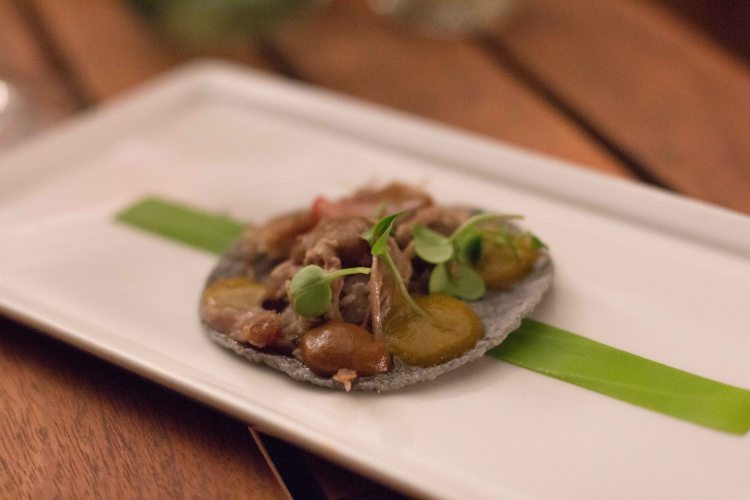 Alongside the crudo, we were served the Salubute de Jaiba, which was perplexing and perhaps the most “challenging” of the evening. What looked like a dark profiterole, was filled with crab. It wasn’t a delicate crab flavour that I’m used to, but something more pungent. Again, I think I may have found more value in this dish if I knew what I was eating because tasted “blindly”, it was my least favourite bite of the evening.
