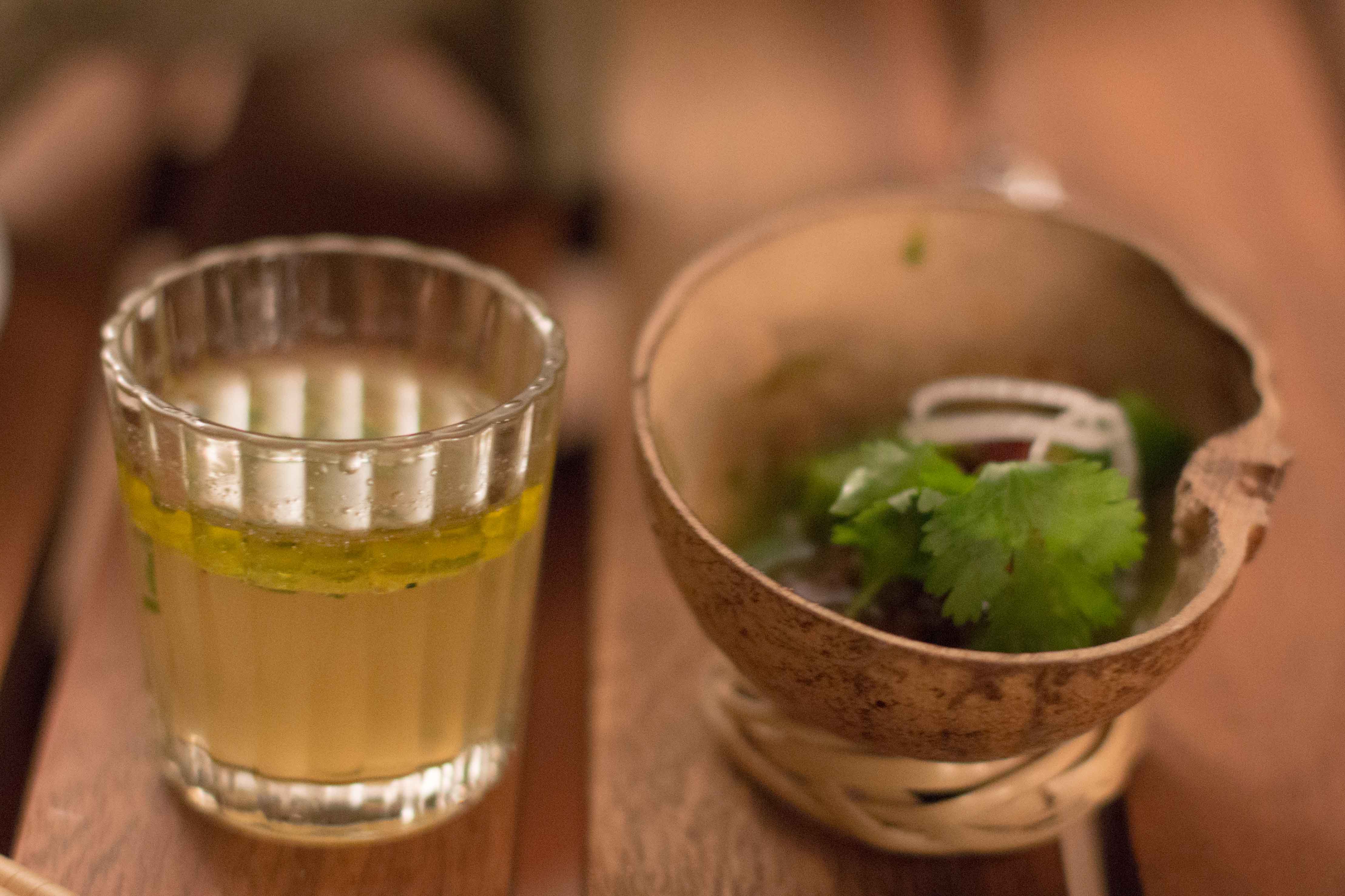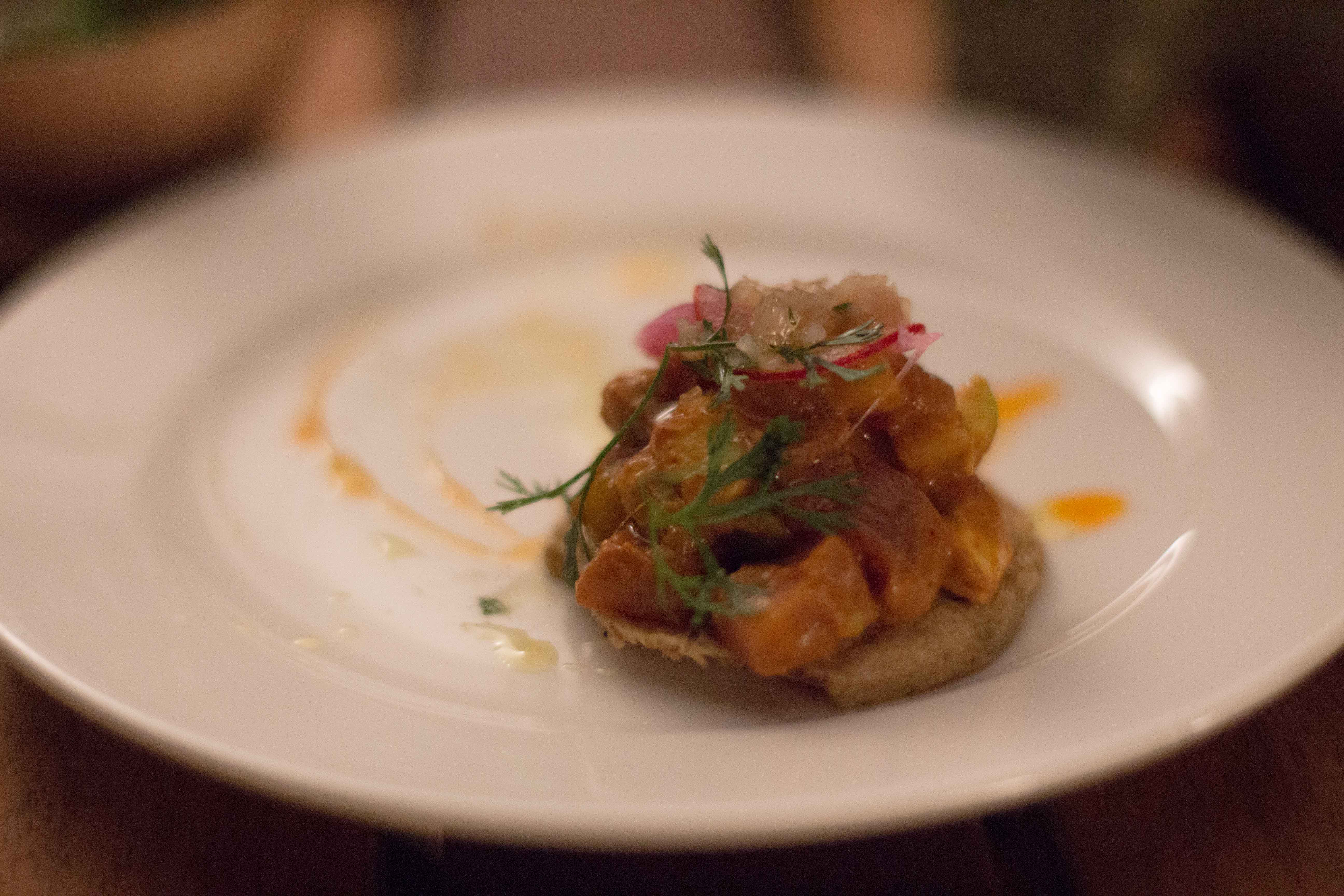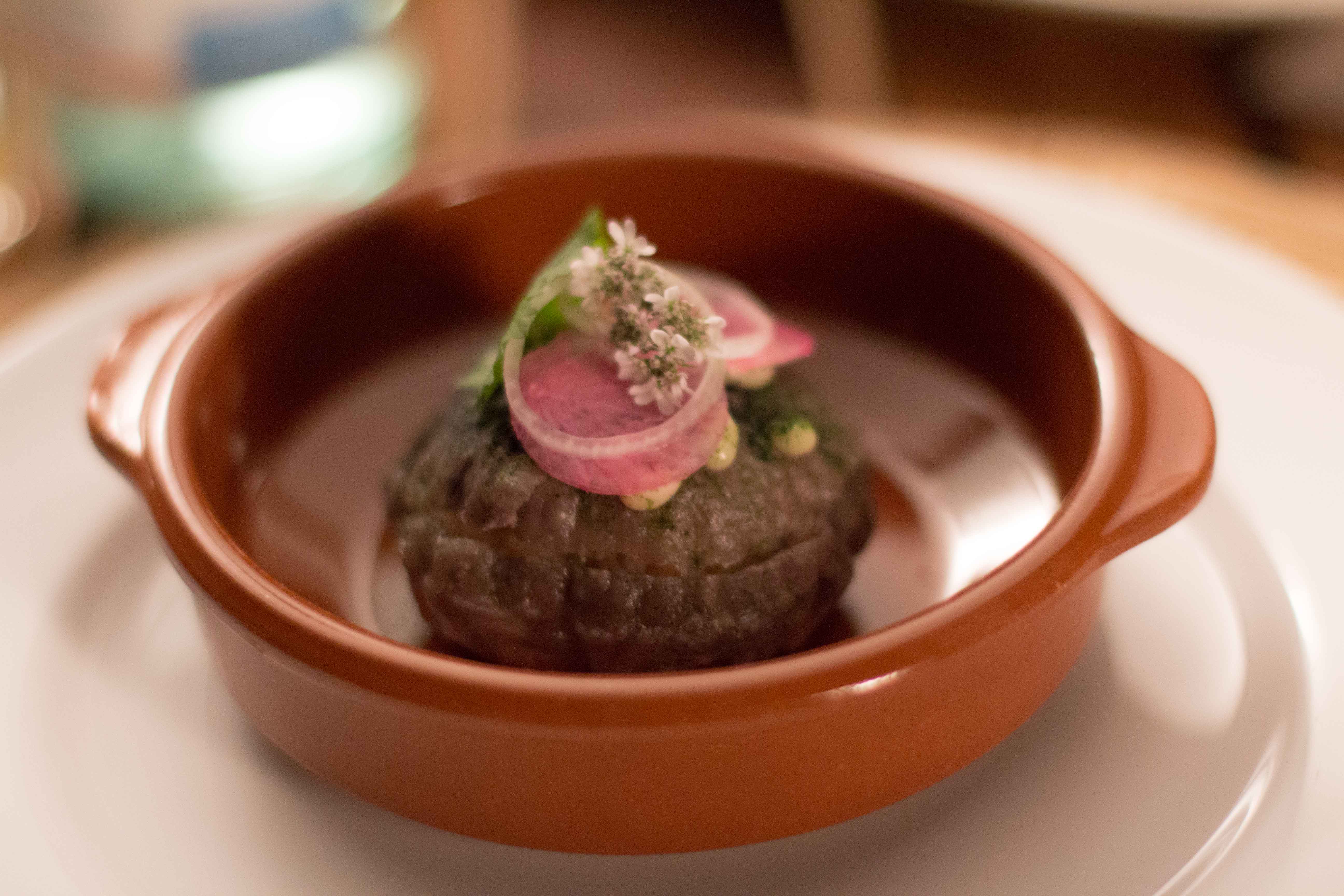 Alongside the crudo, we were served the Salubute de Jaiba, which was perplexing and perhaps the most “challenging” of the evening. What looked like a dark profiterole, was filled with crab. It wasn’t a delicate crab flavour that I’m used to, but something more pungent. Again, I think I may have found more value in this dish if I knew what I was eating because tasted “blindly”, it was my least favourite bite of the evening.