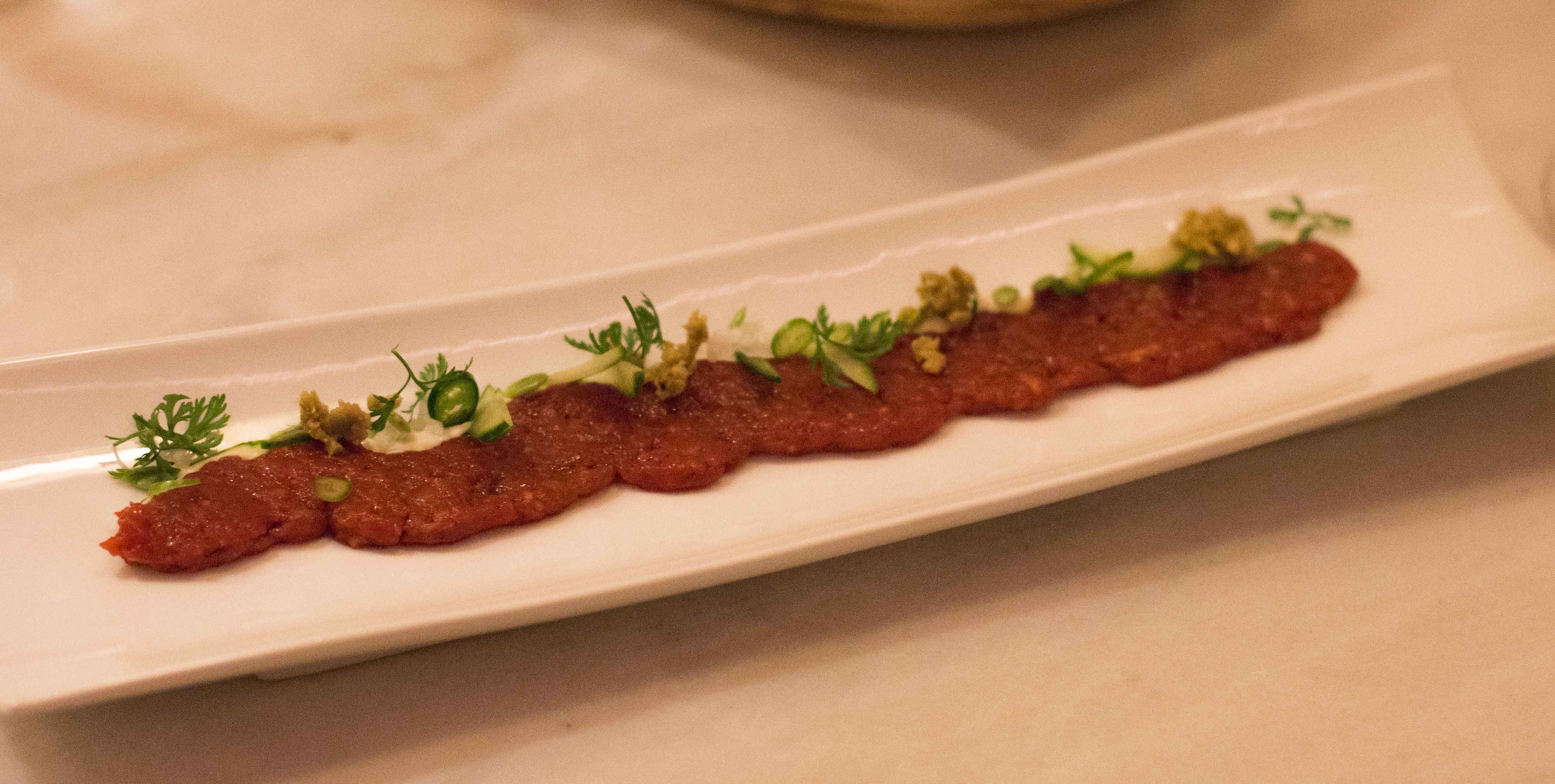 I’d read about Chef Stupak’s lamb tartare before this evening’s dinner. I know that knowing things in advance can spoil the surprise of a dish, but I appreciated knowing that this dish was his interpretation of a Oaxacan lamb barbacoa (bbq). But rather than the lamb being coated in spices and baked underground, Stupak combines the flavours of barcacoa into this raw dish. It wasn’t modern in the sense of “modernist cuisine”, but certainly a revelation. I started to realize that while you could get caught up in how seriously focused Chef Stupak seemed to the point that is could be construed as standoff-ish, but there is a whimsy and creativity to his cooking, coupled with his extraordinary technique that tells a story beyond his seriousness.
