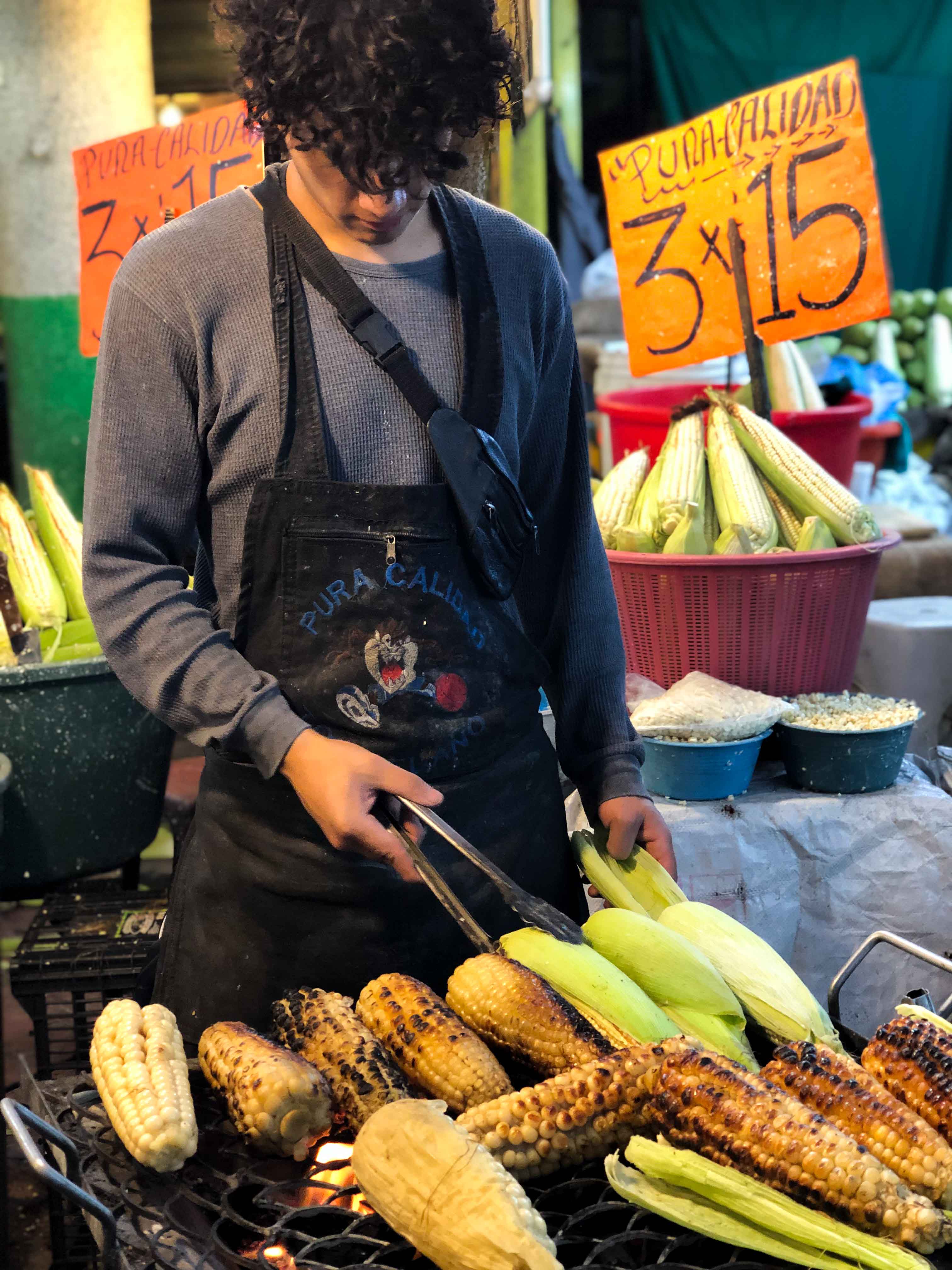 We slowed in front of the corn vendor carefully grilling cobs over the coals. Corn is my favorite food, but after a very bad (stomach) incident many years ago, I have mostly stayed away from Mexican street corn. But my trust in Anais out-weighed my feelings of fear of latter stomach consequences.