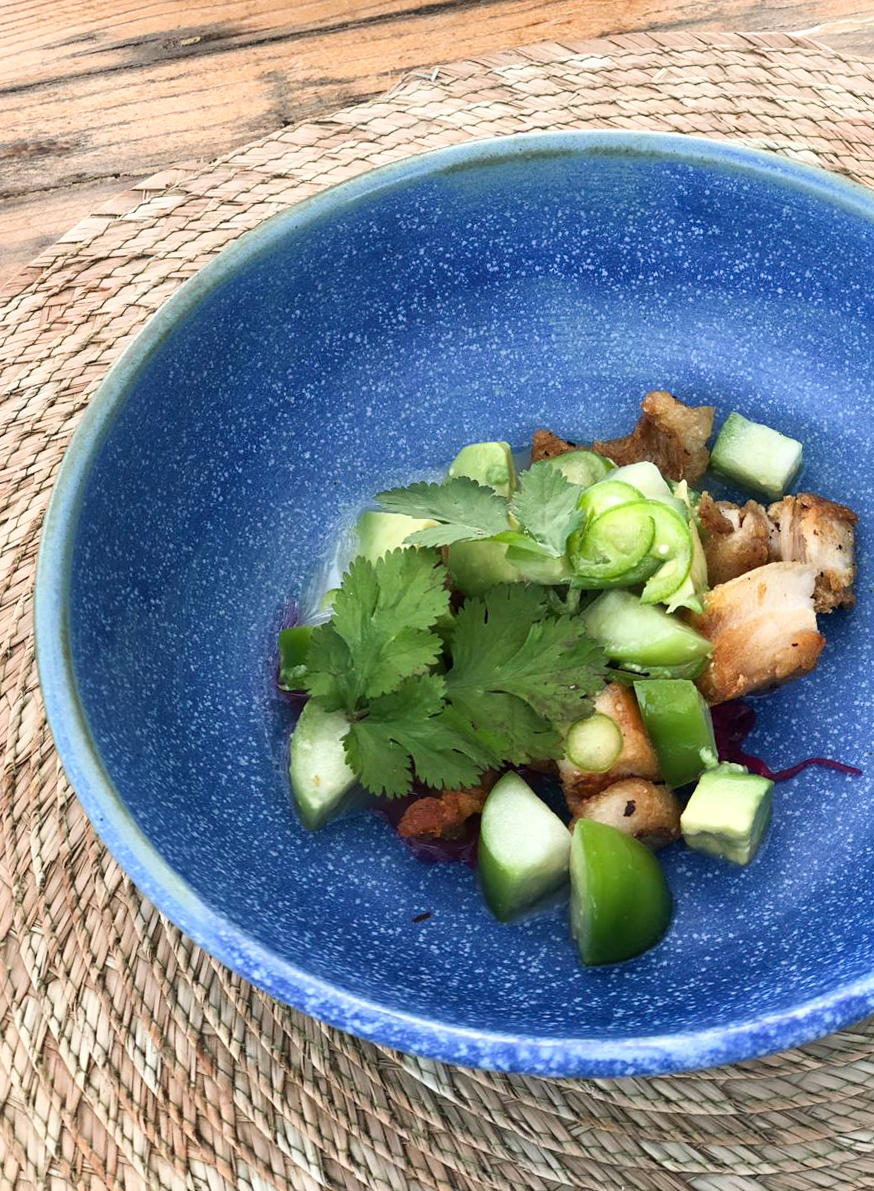 Course 7 – Pork jowl salpicon with tomatillo and cucumber relish. The tart tomatillos and hint of heat from the chiles helped to cut through the richness of the crispy nuggets of pork.