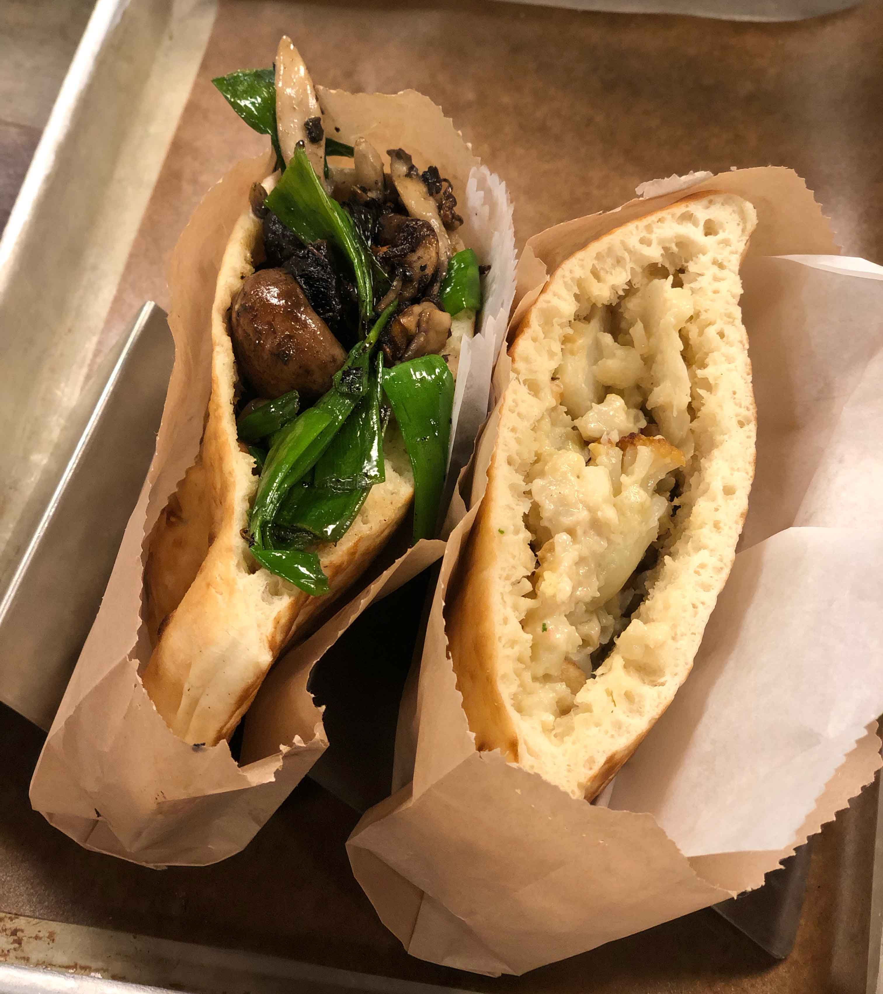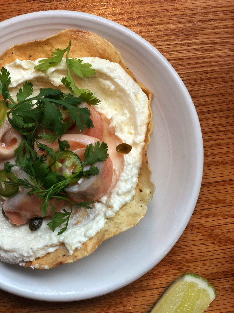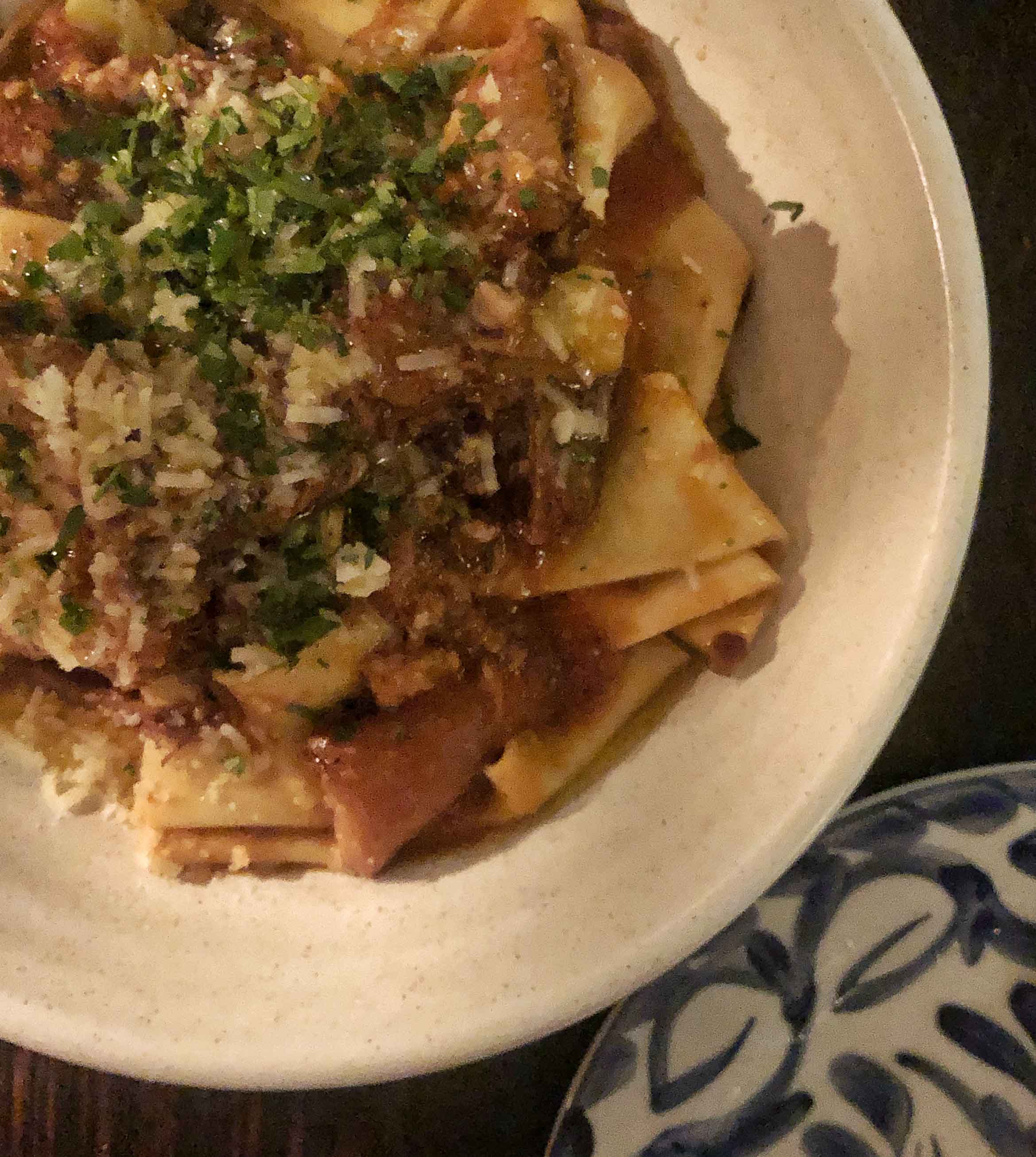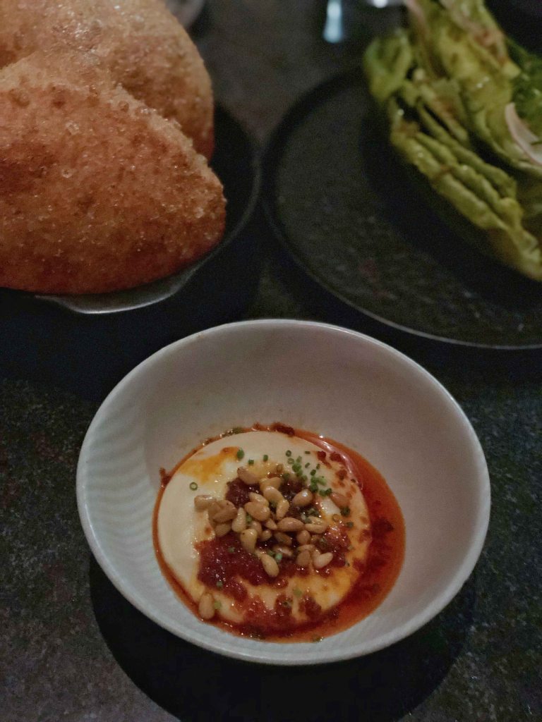 I ordered the bright and refreshing Radicle cocktail made with tequila, raspberry, rhubarb, habanero, cherry tomato and lime. Our meal started out delightfully as we dragged torn-apart pieces of the crisp puffy poori bread through the silky smooth white bean hummus topped with a bright ‘njuda oil. The romaine salad with green goddess dressing and breadcrumbs that we ordered because I wanted us to get our greens, was the kind of dish that made me want to eat more salad.