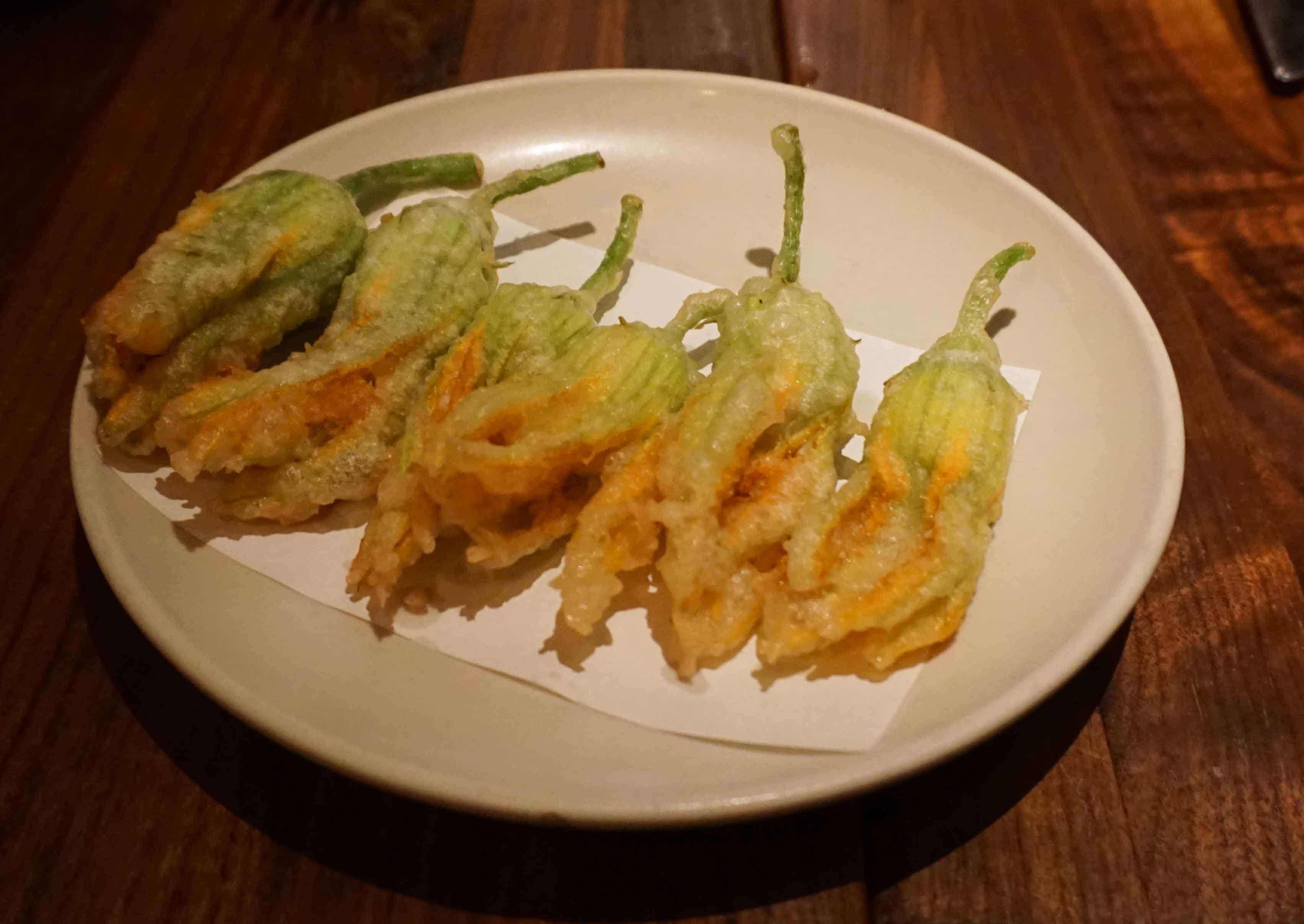 Fiori di zucca filled with crema de ricotta and fried as delicate as tempura and sweet gamberi with bagnetto verde, a sauce made with garlic and parsley.