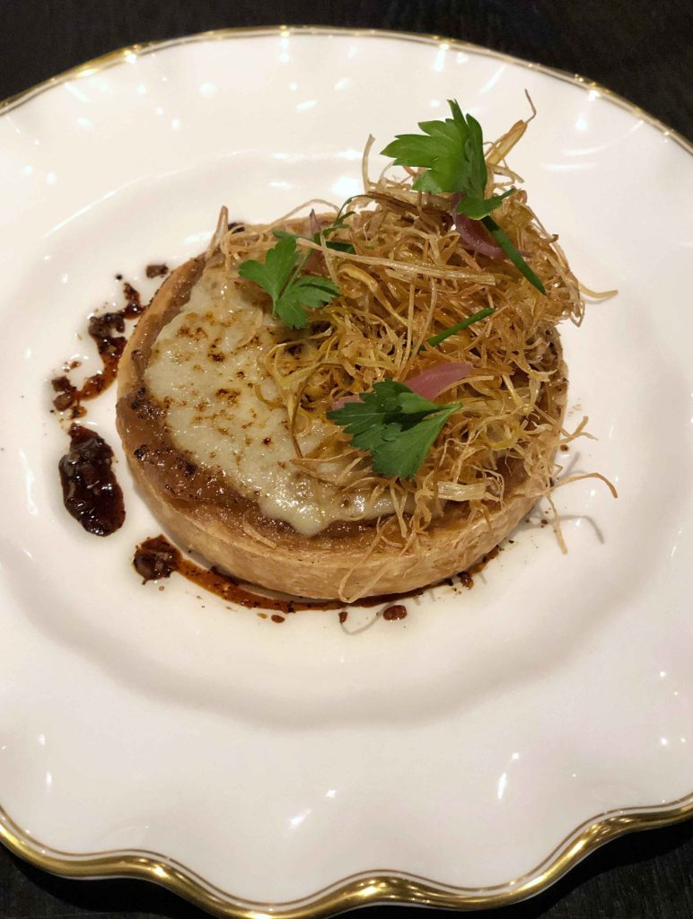 Ragout d’oignons caramélisés, basically a french onion soup in tart form was soul satisfying and carnard bourdelaise, a savory bread pudding made with duck confit and nuggets of preserved cherries.