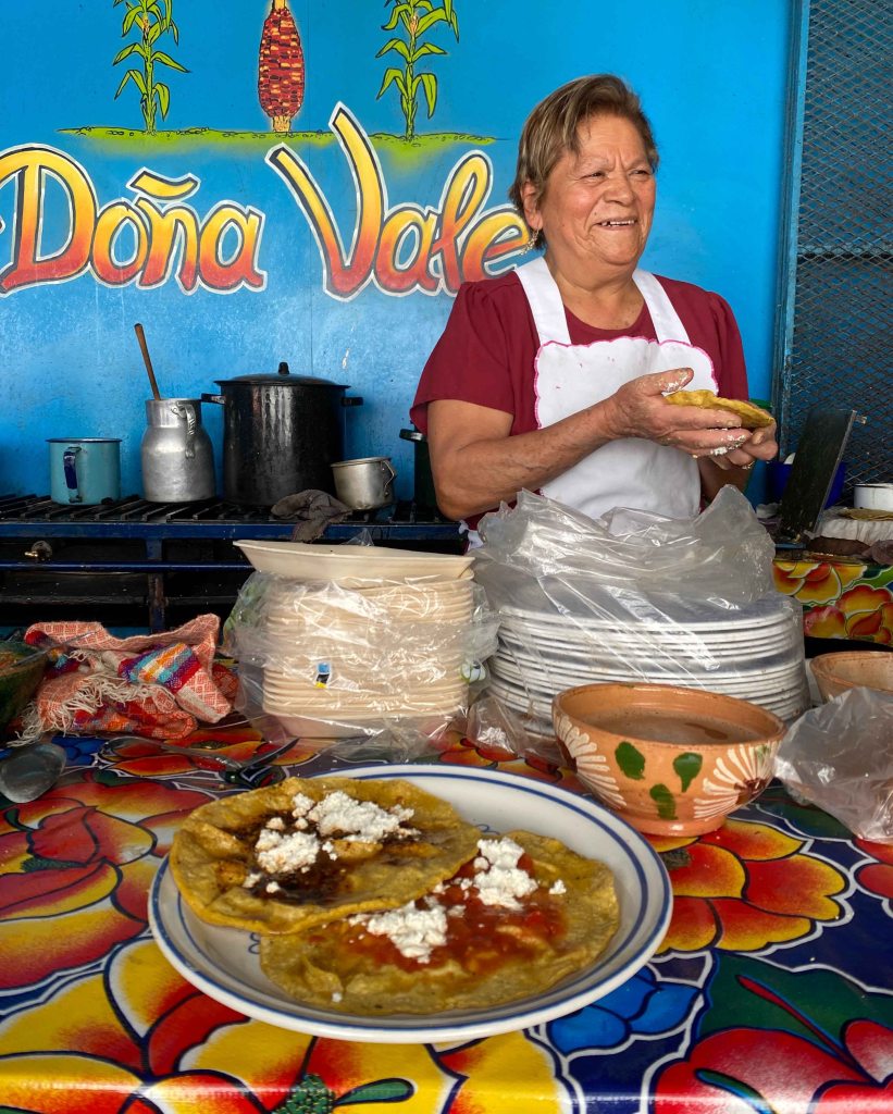 Doña Vale: If you happen to be tackling the gigantic Abastos market, then it’s worth trying to search out Doña Vale. Her memelas are simple, but carry with them the true flavour of Oaxaca; masa, asiento (lard), salsa and cheese. It’s the hand (and heart) of Doña Vale that makes these one of the best tastes of Oaxaca.