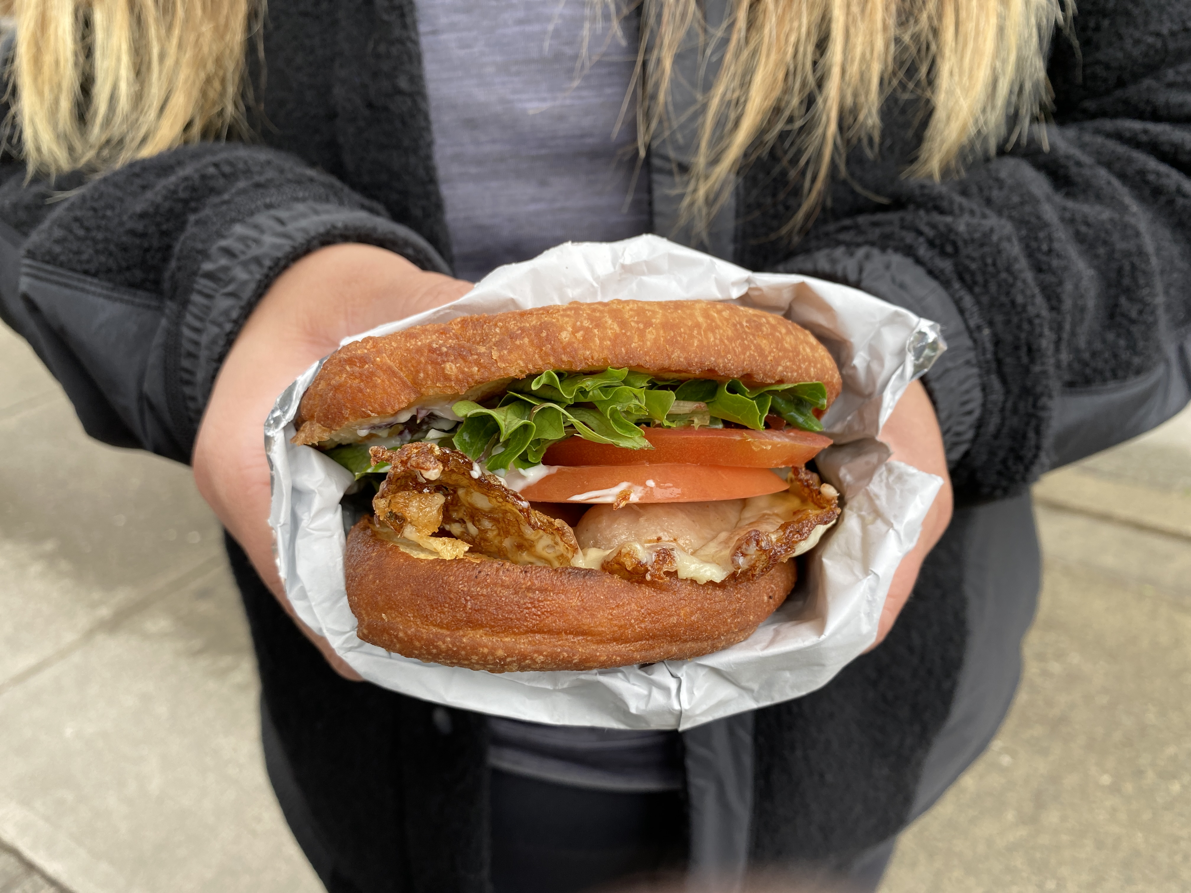 Rhino Coffee House seems to be the “it” place for coffee and a donut in town (with a constant morning line-up to prove it). I chose the Bro-nut, a breakfast sandwich with bacon, egg and veggies on a savoury donut.