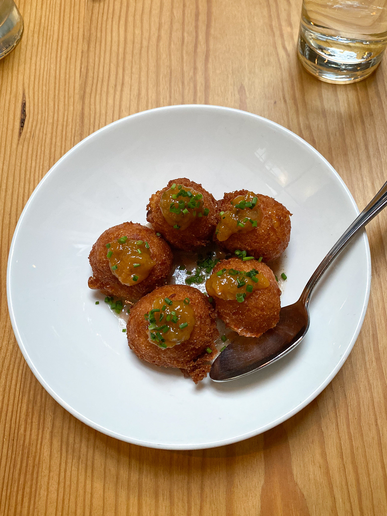 The menu at Miller Union was filled with so much delight that it was hard to choose. But I narrowed in on the sweet corn fritters with pecan butter and peach/chile marmalade, the farm egg baked in celery cream, roasted oysters with creamed chard, and an amazing vanilla crème bavaroise, black cocoa cake, milk chocolate ganache, dark chocolate tuile. A round of mains hit the table between starters and dessert, but they left me feeling like I should have stuck to the top and bottom of the menu where the real stars of the evening were.