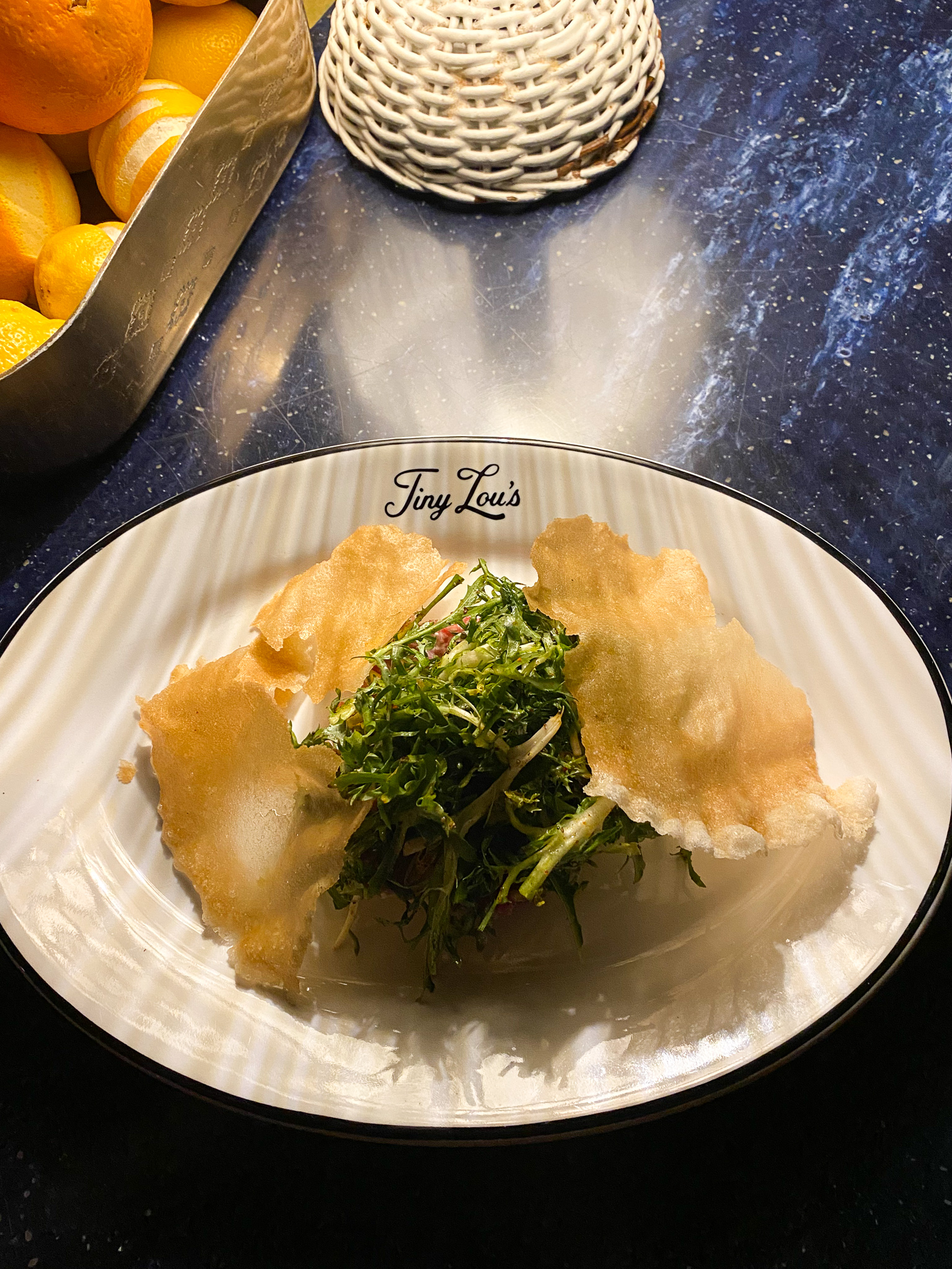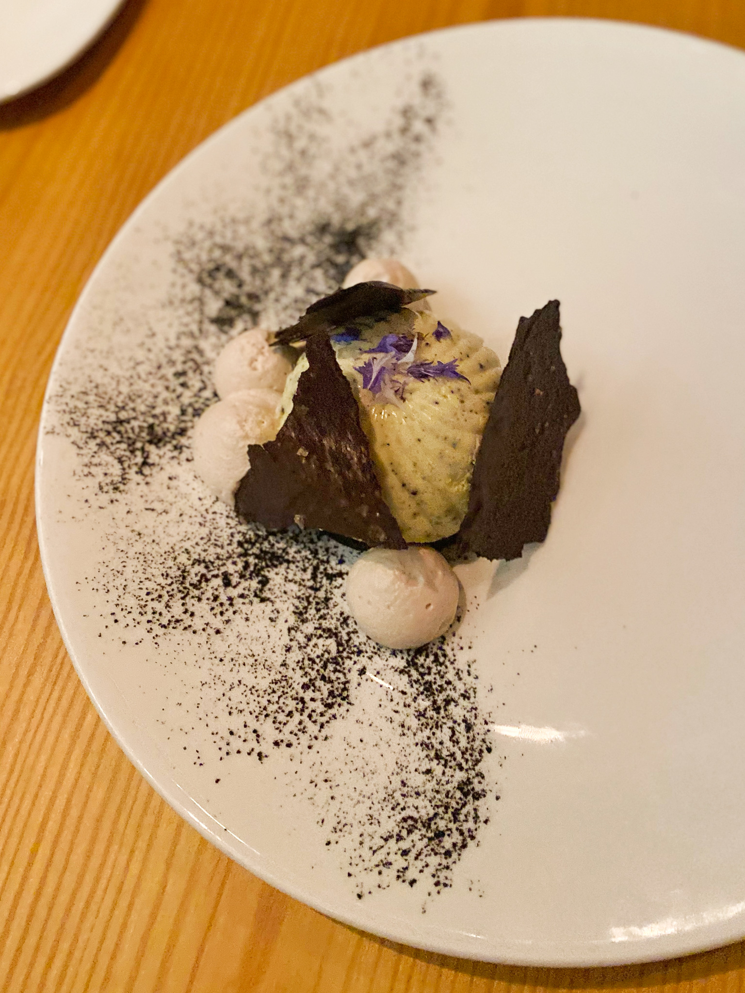 Tiny Lou’s most famous dessert, Hello Blondie is a banana blondie with hazelnut praline, and Valrona chocolate, named after the famed “Blondie” at the Clermont Lounge downstairs of the hotel. But the real star was the Georgia Peach crepe cake with so many layers of raspberry crepes between peachy vanilla mascarpone.