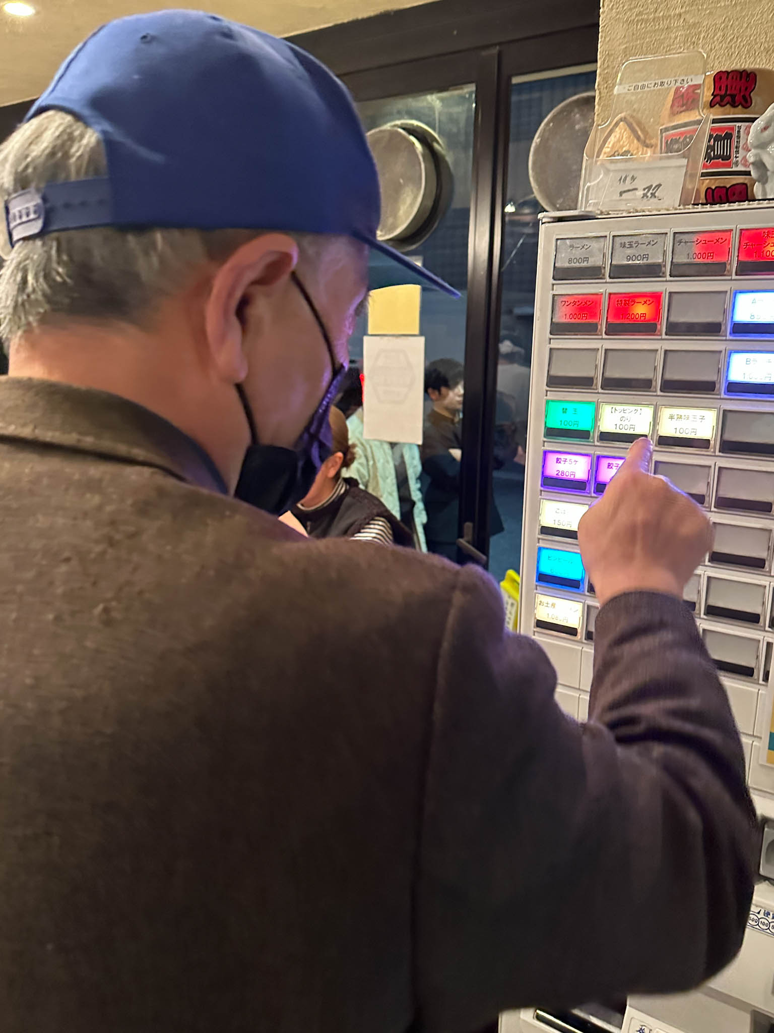 When we arrived at Hakata Issou, there was a line which I realized was a short compared to what could, be judging from the stanchions lined up all the way down the block. After a 20 minute wait, we got to the front of the line and were invited inside to purchase our order. It took us a while to navigate the vending machine to pay, but we finally figured it out.