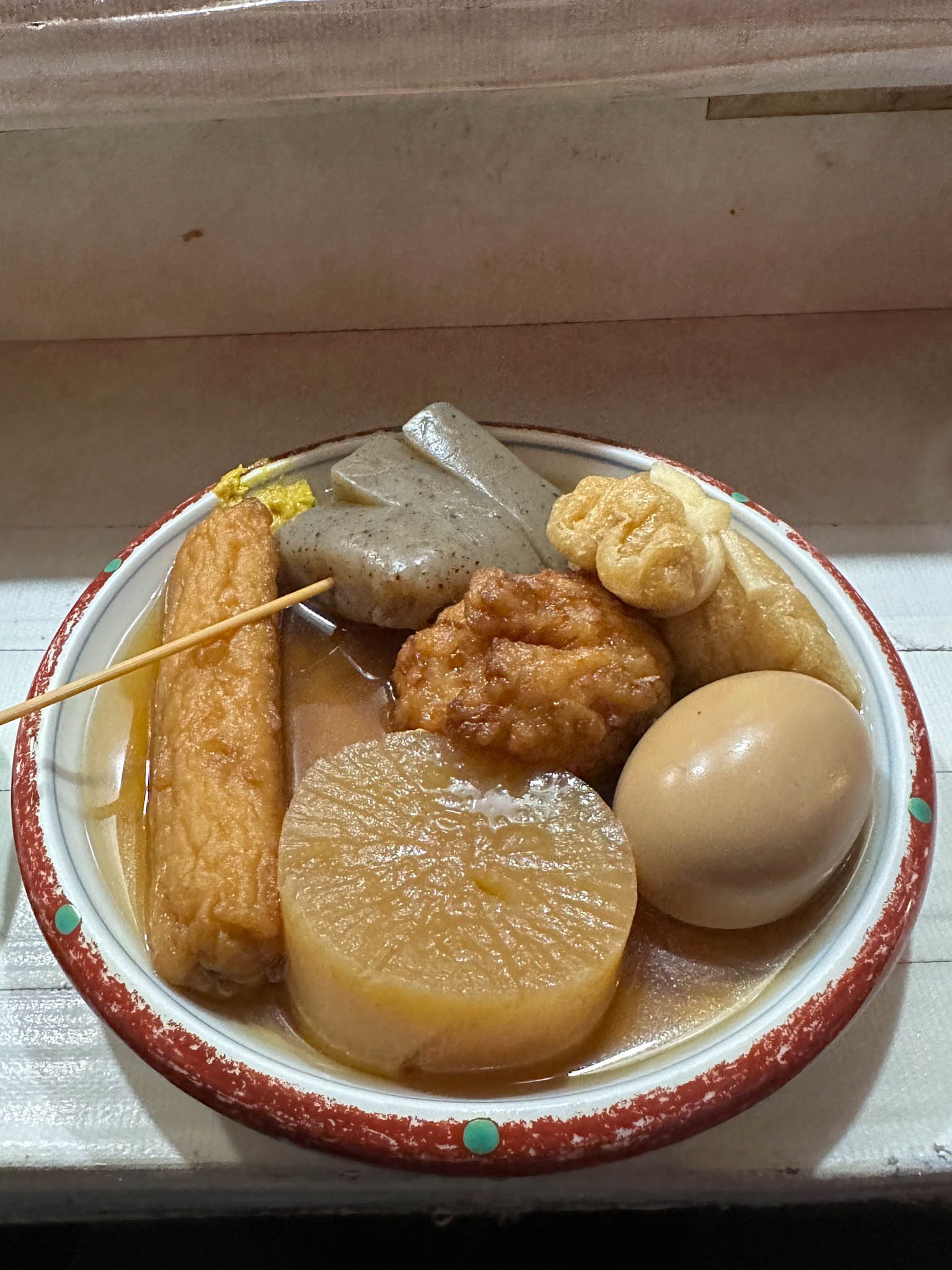 It was a cool spring evening, so as we were sat the bubbling pot of oden caught my eye. After ordering a cup of Nihon-shu (sake), we just started pointing at the things we wanted (all of it) and our items were quickly placed in front of us. Oden is my comfort food, but rarely eat it at home so I try to eat it when I see it in Japan. We also ordered some vegetables and yakisoba but the highlights were the omelette filled with mentaiko and bowl of ramen which was lighter and easier to eat than the one from the previous evening at Hakata Issou.