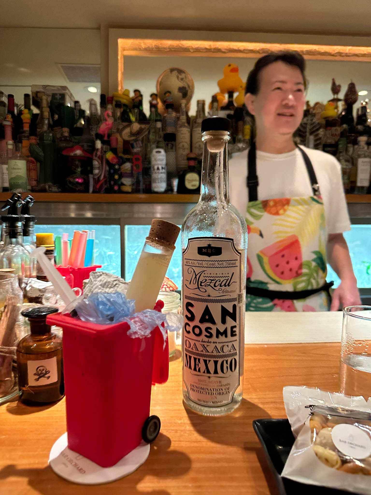 Determined to drink everything yuzu while I was in Japan, that was my first choice. I was served a tasty yuzu gin cocktail with matcha presented in a bucket and watering can. The idea is to “water” your cocktail over ice. My second was a mezcal yuzu ginger cocktail served in a test tube & syringe in a garbage can When I’ve researched Bar Orchard in the past, I’ve been turned off by their kitschy serving-ware. But despite my feelings, the cocktails at Bar Orchard were delicious and the creativity (& gimmicks) helped make for a festive mood in the bar, which I gladly welcomed in my evening.