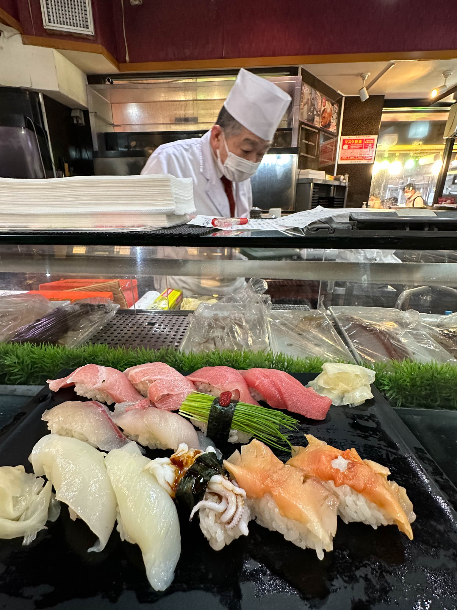 With only one full day in Tokyo, I carefully chose my eating itinerary to make sure I was satisfying my cravings. First up was an early morning visit to Tsukiji as has been our ritual on our past many visits to Tokyo. Our plan is always to get there before 7am to beat the hoards and eat at the secondary location of Sushi Zanmai in the market. When we arrived, I was somewhat surprised to see that the market was already teeming with tourists and that the vendors in the outer market had changed their sales tactics to mostly serve ready to eat servings. The lines for people waiting to have tamago, wagyu beef cubes, strawberry mochi, grilled fish collars, all served on sticks was overwhelming. As we weaved through the hoards, I was hoping that Sushi Zanmai Bekkan wouldn’t have been “found” with a long line up.